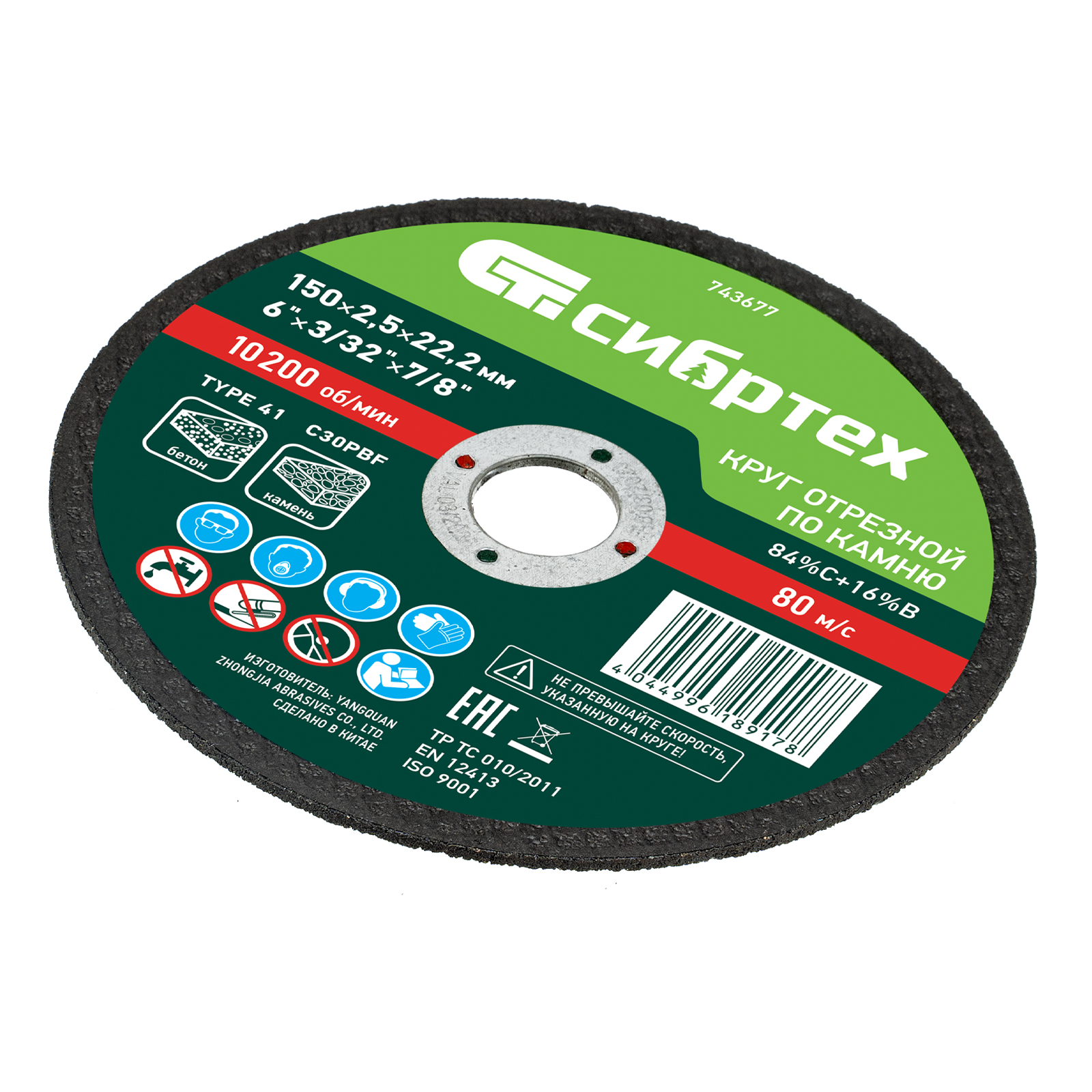 <p>Отрезной круг по камню Сибртех 743677 размером 150 х 2,5 х 22,2 мм — оснастка для ручной углошлифовальной машины, предназначенная для реза камня, огнеупорного кирпича, бетонных изделий, керамической плитки. Использования смазочно-охлаждающих жидкостей не требуется. Пригодится в быту, частной мастерской или на небольшом производстве.</p><h2>Преимущества</h2><ul><li>Высокая производительность и аккуратный рез — абразивные зерна из карбида кремния имеют острые грани и легко справляются с твердыми материалами.</li><li>Безопасная работа — надежная двухслойная стеклосетка увеличивает устойчивость круга к разрыву при высоких нагрузках.</li><li>Высокий ресурс — бакелитовая связка с упрочняющими элементами надежно удерживает зерна абразива.</li><li>Надежность — круг изготовлен на высококачественном оборудовании по современной технологии.</li></ul>