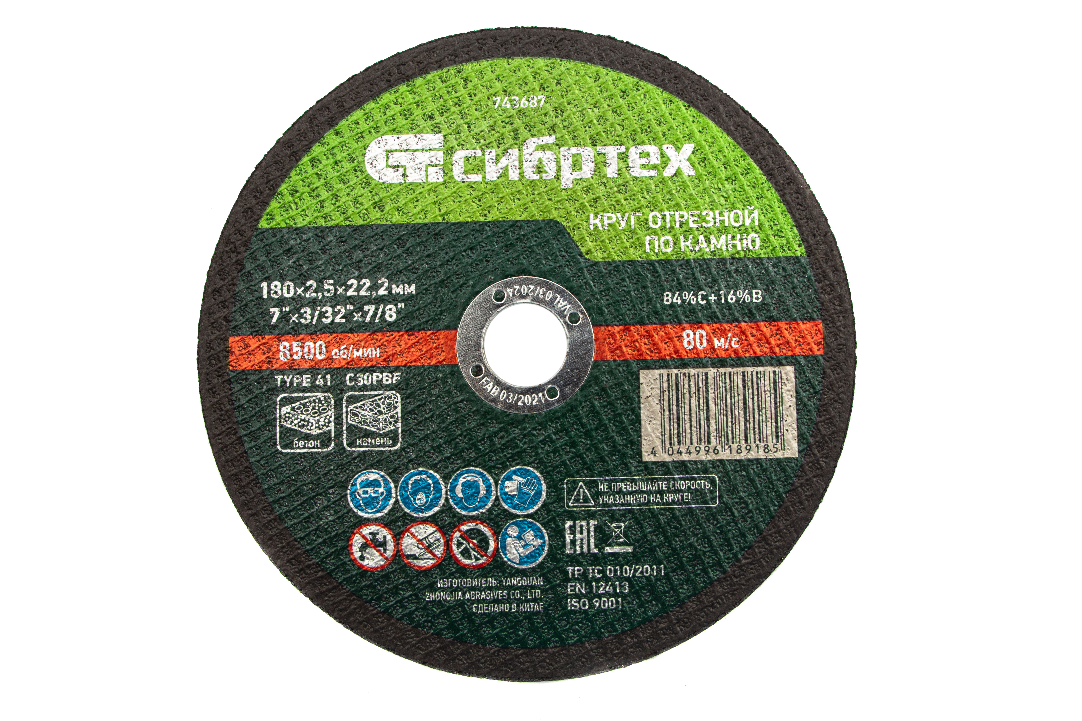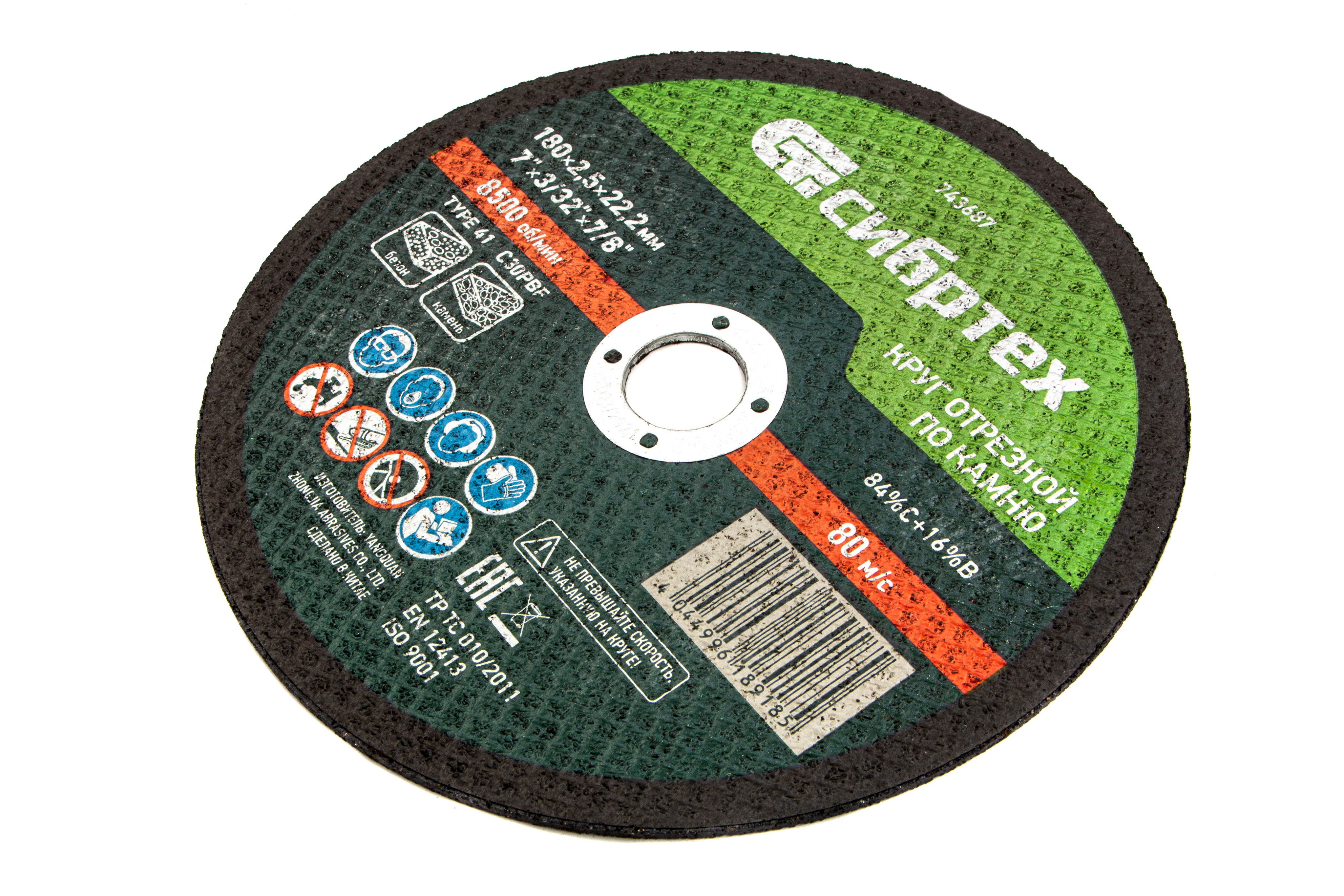 <p>Отрезной круг по камню Сибртех 743687 размером 180 х 2,5 х 22,2 мм — оснастка для ручной углошлифовальной машины, предназначенная для реза камня, огнеупорного кирпича, бетонных изделий, керамической плитки. Использования смазочно-охлаждающих жидкостей не требуется. Пригодится в быту, частной мастерской или на небольшом производстве.</p><h2>Преимущества</h2><ul><li>Высокая производительность и аккуратный рез — абразивные зерна из карбида кремния имеют острые грани и легко справляются с твердыми материалами.</li><li>Безопасная работа — надежная двухслойная стеклосетка увеличивает устойчивость круга к разрыву при высоких нагрузках.</li><li>Высокий ресурс — бакелитовая связка с упрочняющими элементами надежно удерживает зерна абразива.</li><li>Надежность — круг изготовлен на высококачественном оборудовании по современной технологии.</li></ul>