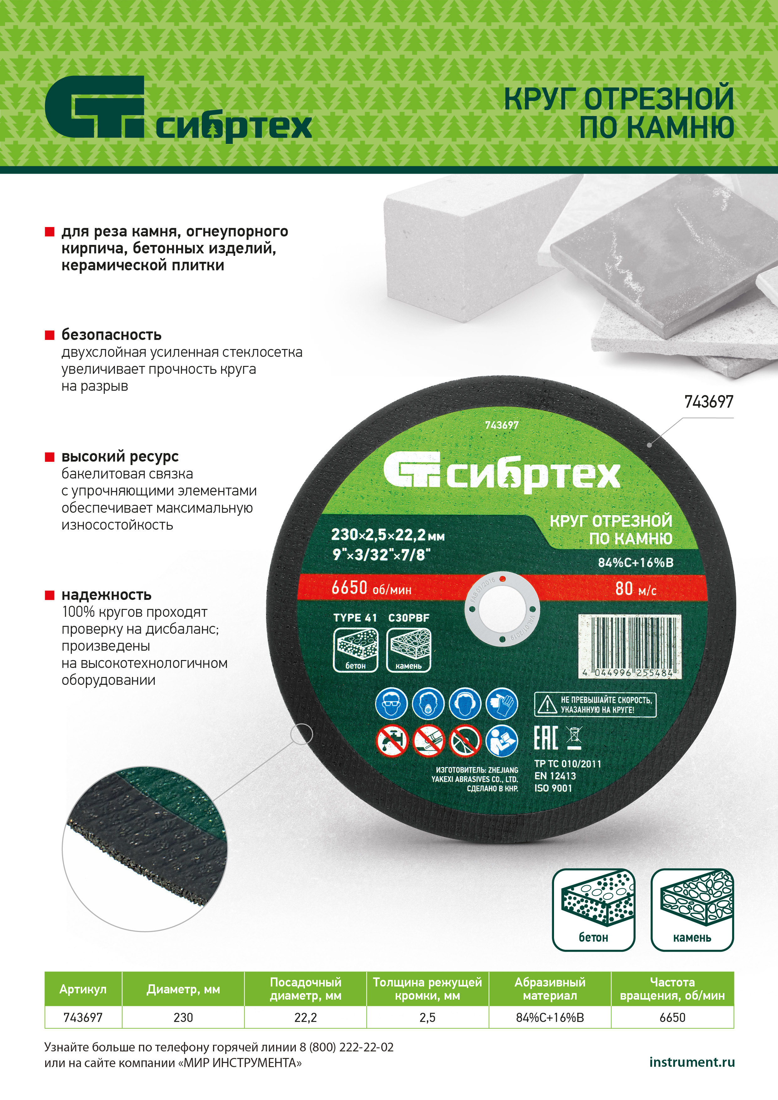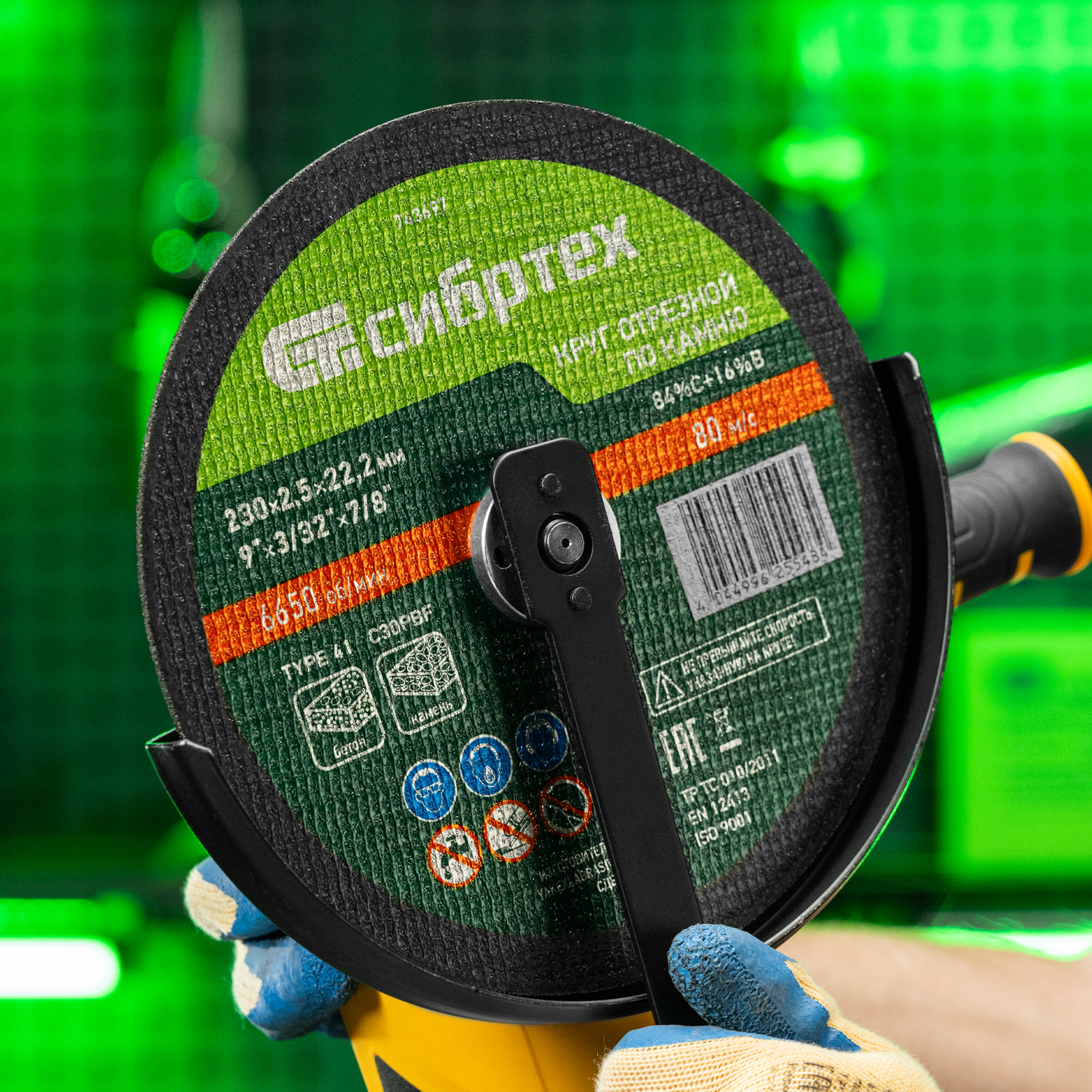 Отрезной круг Сибртех 84%C+16%B 743697 диаметром 230 мм и толщиной 2,5 мм — оснастка для ручной углошлифовальной машины с посадочным размером 22,2 мм, предназначенная для резки камня, огнеупорного кирпича, бетона, керамической плитки. Использование смазочно-охлаждающих жидкостей не требуется. Диск обеспечивает эффективный рез при частоте вращения не более 6650 об/мин.