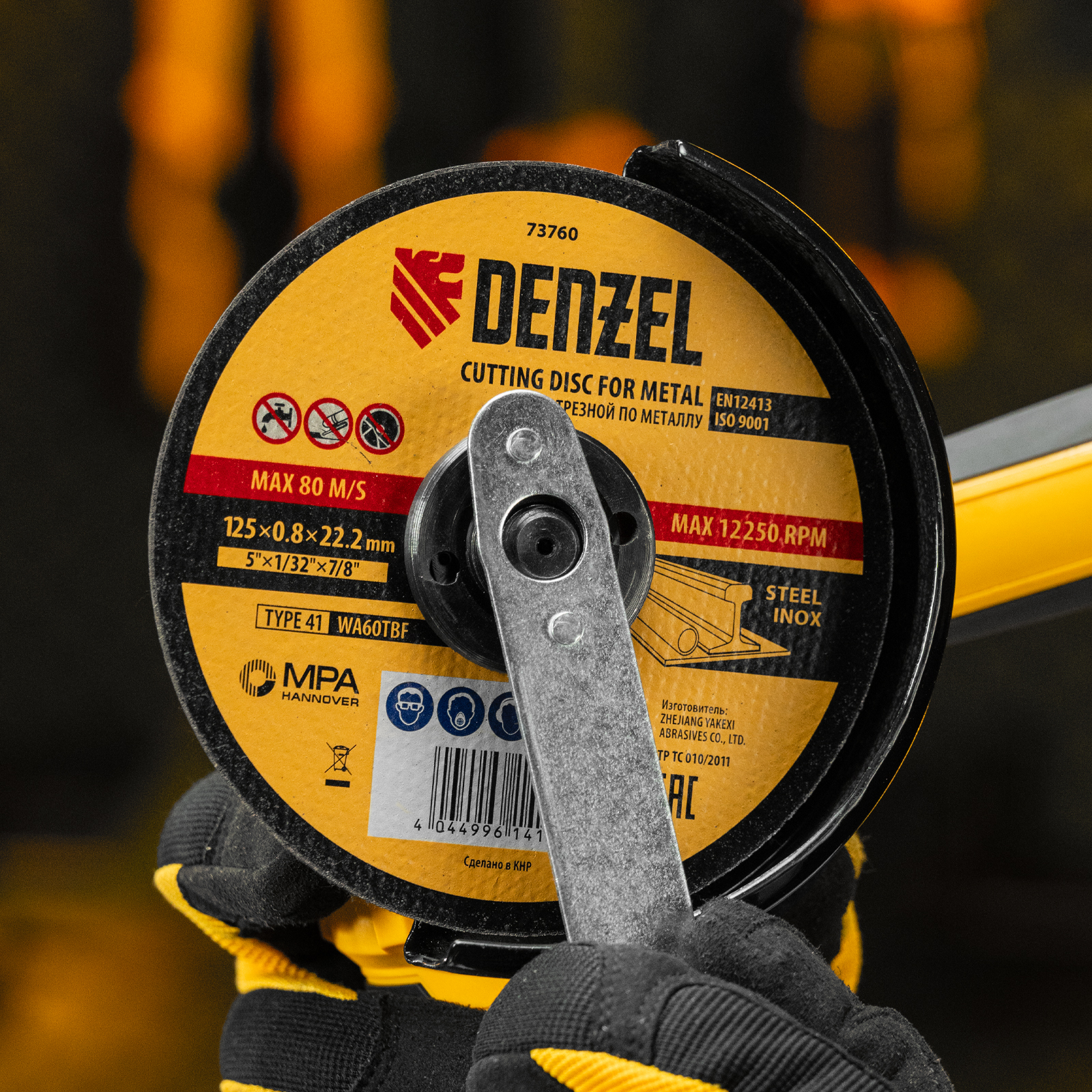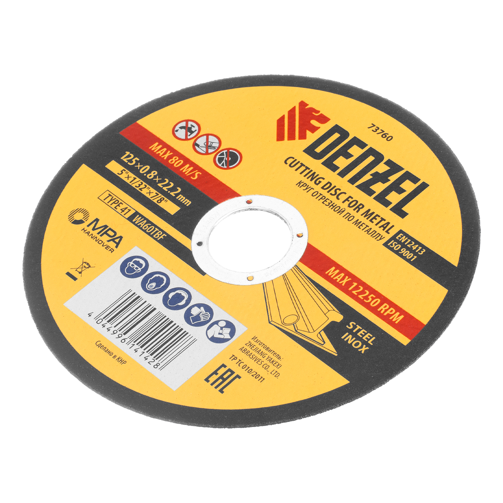 Отрезной круг по металлу Denzel WA60TBF 73760 диаметром 125 мм и толщиной 0,8 мм устанавливается на углошлифовальную машину с посадочным размером 22,2 мм. Предназначен для сухого резания углеродистых и нержавеющих сталей. Максимальная частота вращения составляет 12250 об/мин. Круг пригодится в слесарной мастерской.