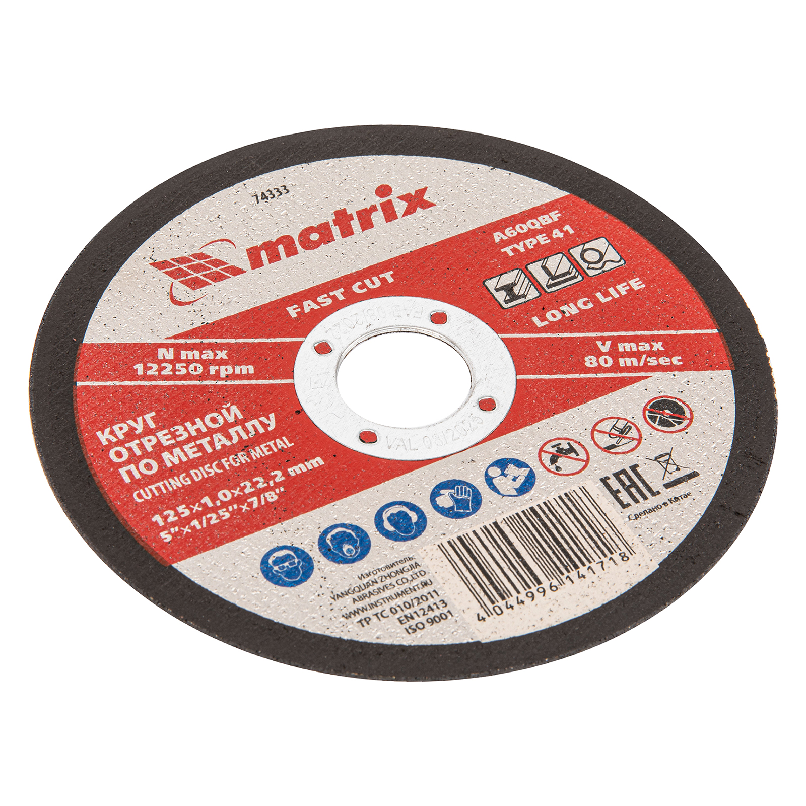 Отрезной круг по металлу Matrix A60QBF 74333 размером 125 х 1,0 х 22,2 мм оптимален для реза углеродистых сталей. Устанавливается на углошлифовальные машины с посадочным диаметром 22,2 мм. Круг рассчитан на бытовое использование в частной мастерской или гараже.