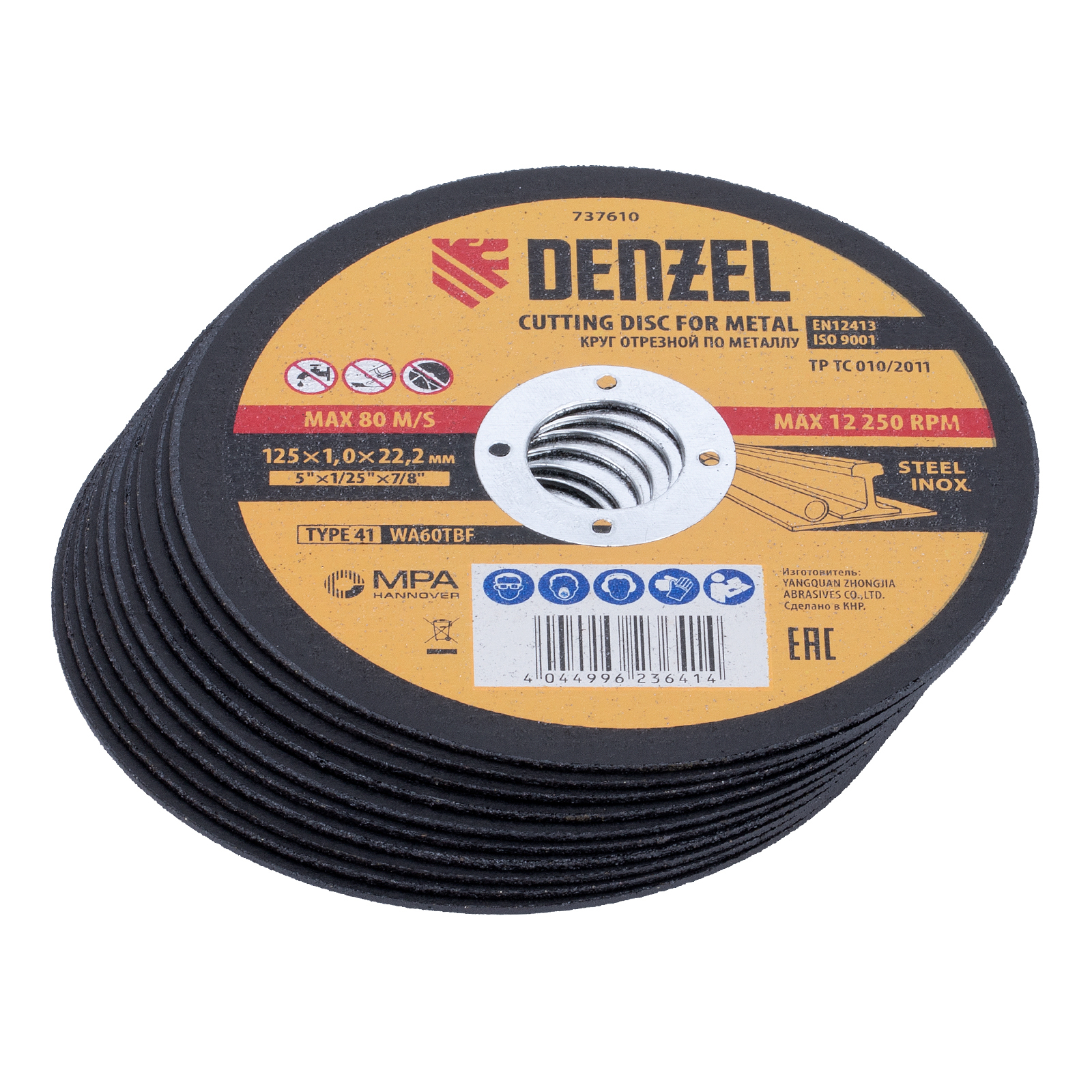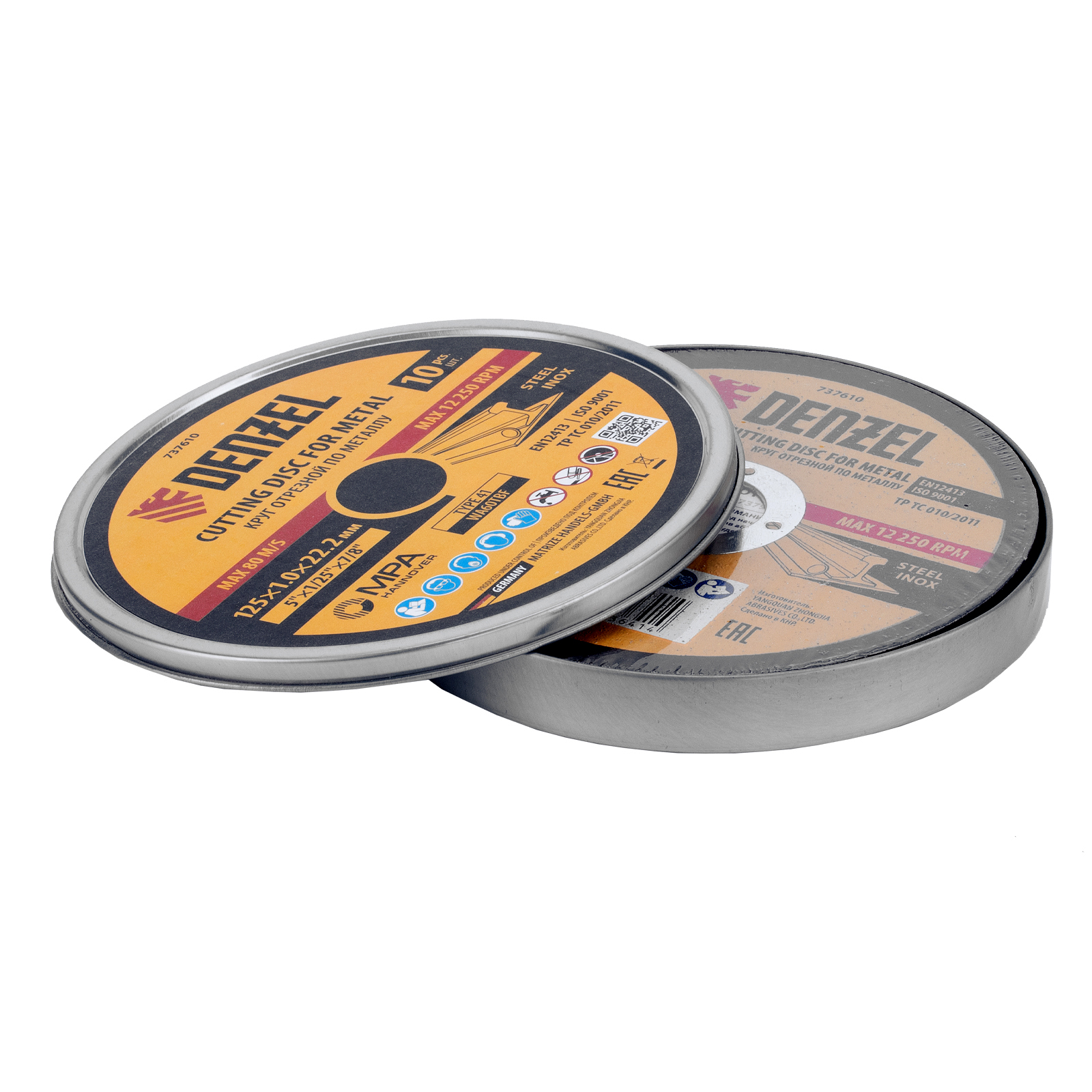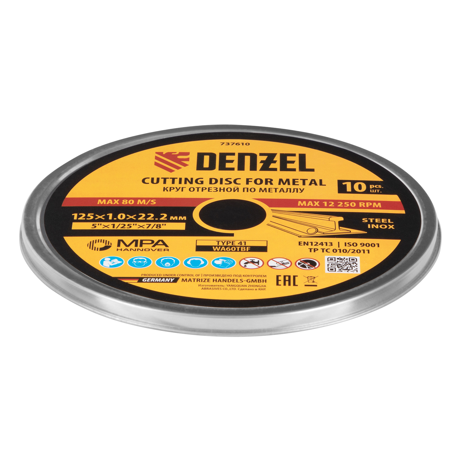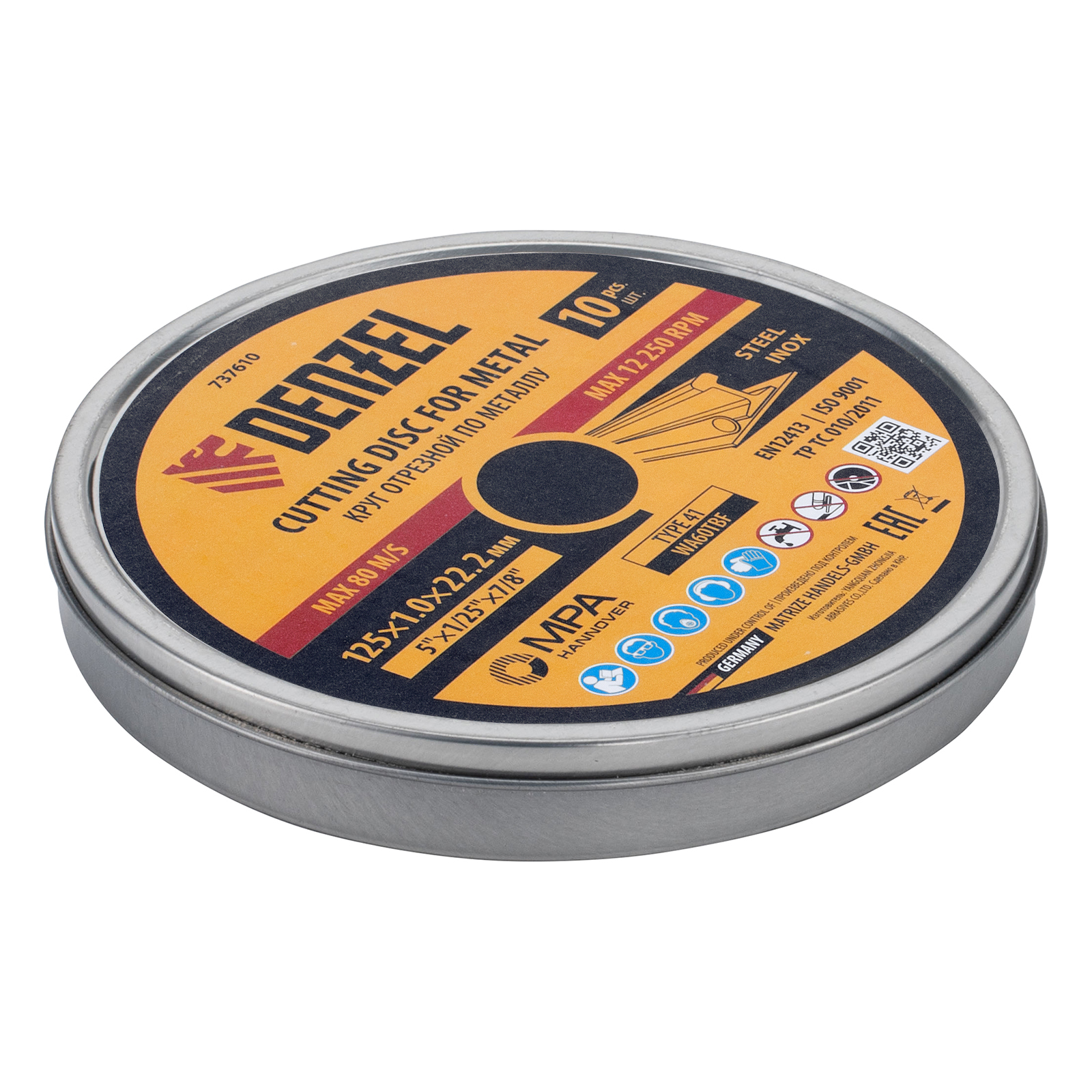 Круг отрезной по металлу Denzel 737610 (WA60TBF) размером 125 х 1,0 х 22,2 мм, 10 шт. в металлической банке, устанавливается на УШМ соответствующего типоразмера. Универсальная оснастка подходит для резки нержавеющей и углеродистой стали. Набор предназначен для профессионального использования и большого объема работ.