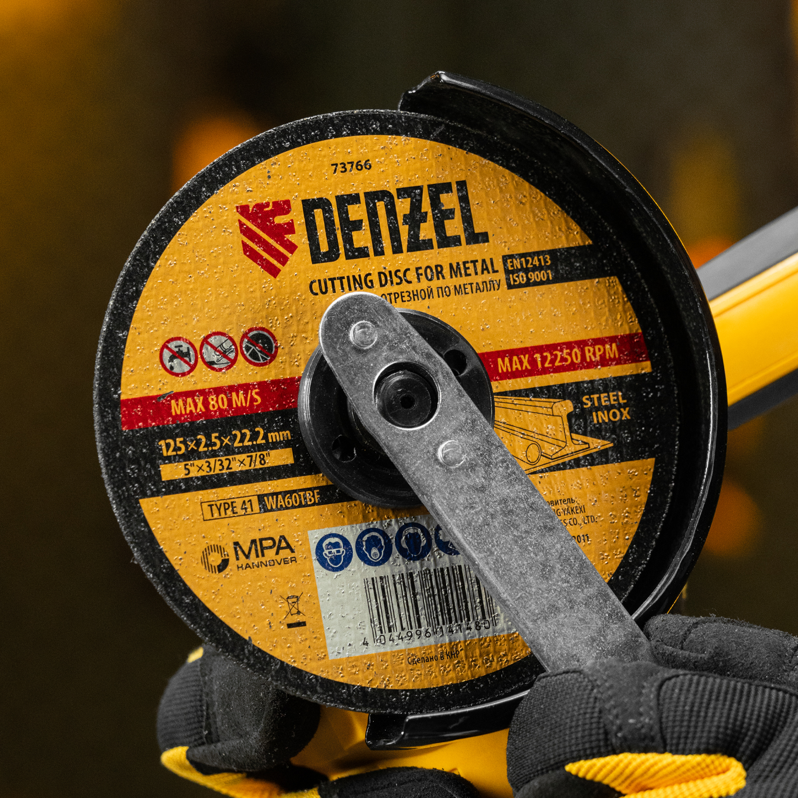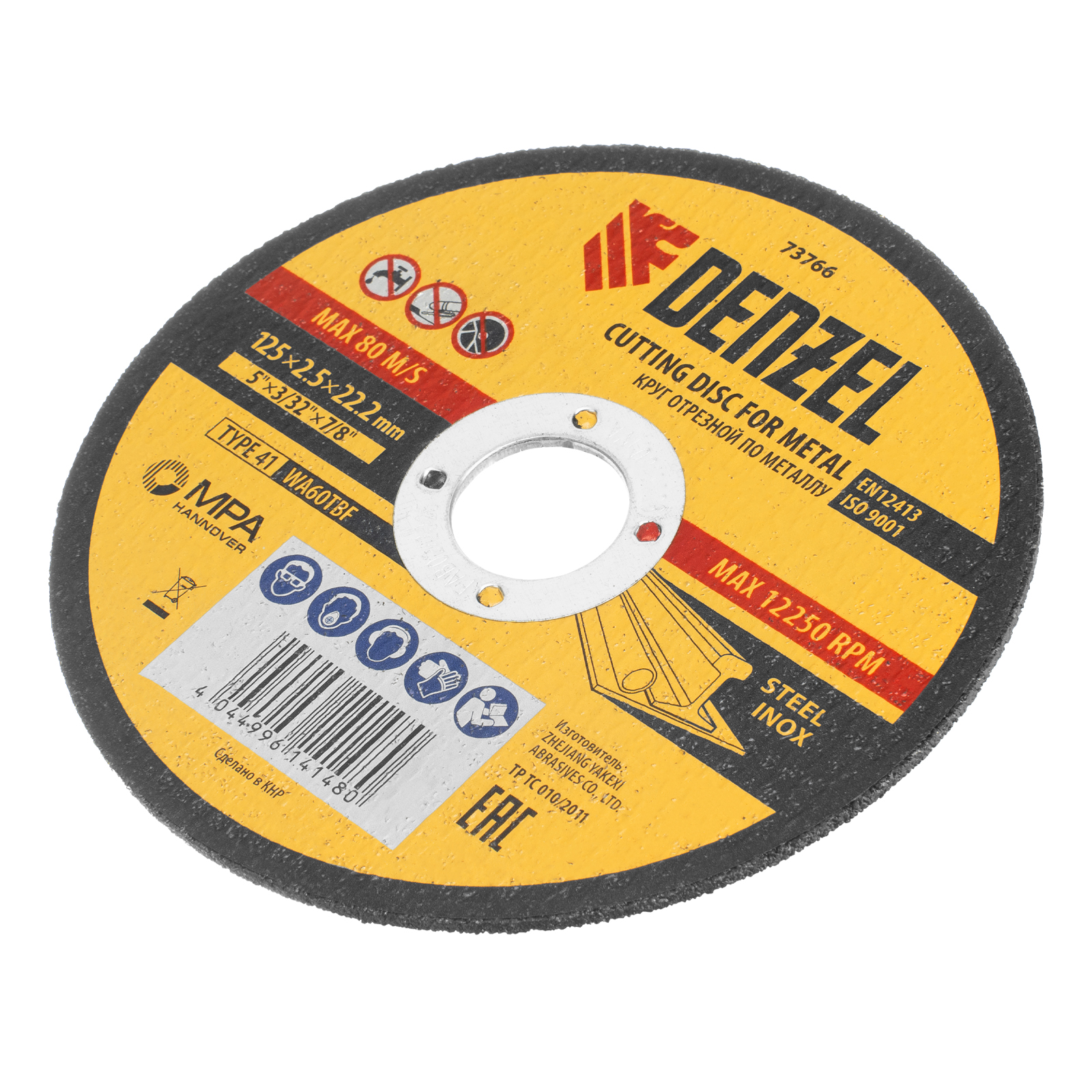 Отрезной круг по металлу Denzel WA60TBF 73766 диаметром 125 мм и толщиной 2,5 мм устанавливается на углошлифовальную машину с посадочным размером 22,2 мм. Предназначен для сухого резания углеродистых и нержавеющих сталей. Максимальная частота вращения составляет 12250 об/мин. Круг пригодится в слесарной мастерской.