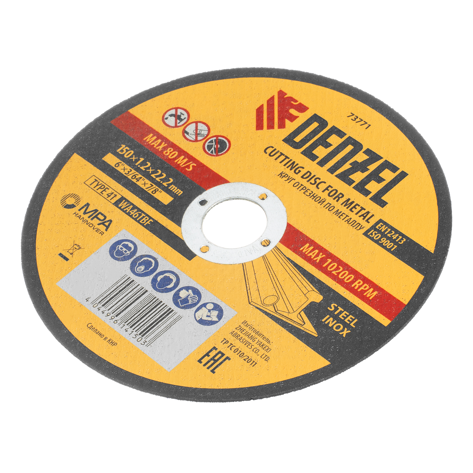 Отрезной круг по металлу Denzel WA46TBF 73771 диаметром 150 мм и толщиной 1,2 мм устанавливается на углошлифовальную машину с посадочным размером 22,2 мм. Предназначен для сухого резания углеродистых и нержавеющих сталей. Максимальная частота вращения составляет 10200 об/мин. Круг пригодится в слесарной мастерской.
