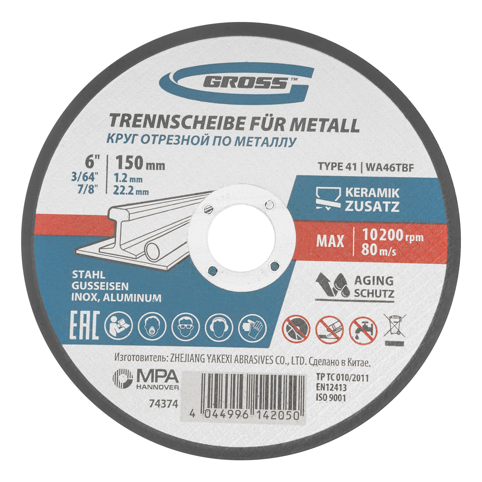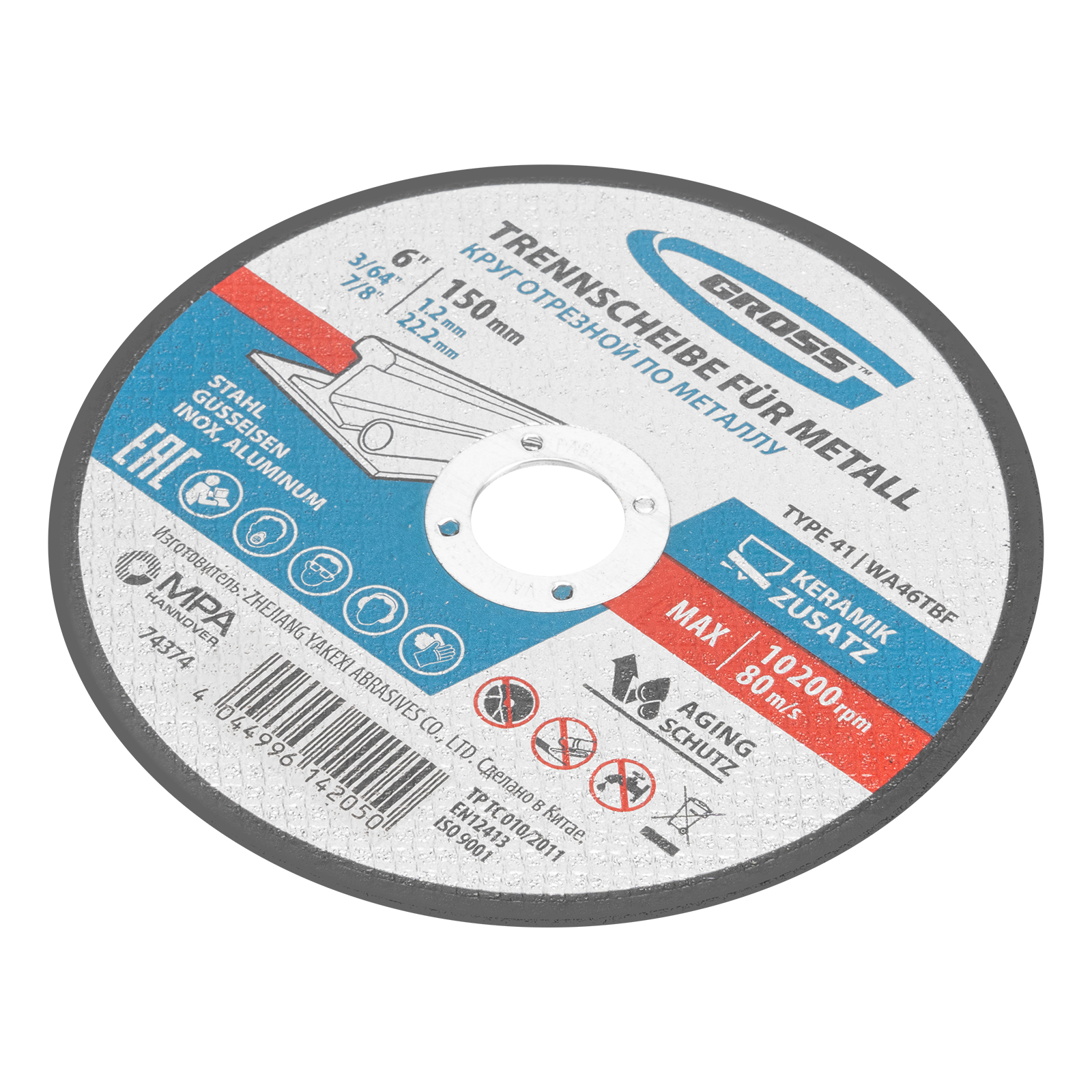 Отрезной круг по металлу Gross WA46TBF 74374 диаметром 150 мм и толщиной 1,2 мм устанавливается на фланец углошлифовальной машины с посадочным размером 22,2 мм. Предназначен для сухого резания углеродистых и нержавеющих сталей, а также алюминия и чугуна. Рекомендованная максимальная частота вращения составляет 10200 об/мин. Круг выдерживает высокие нагрузки и подходит для профессионального использования.