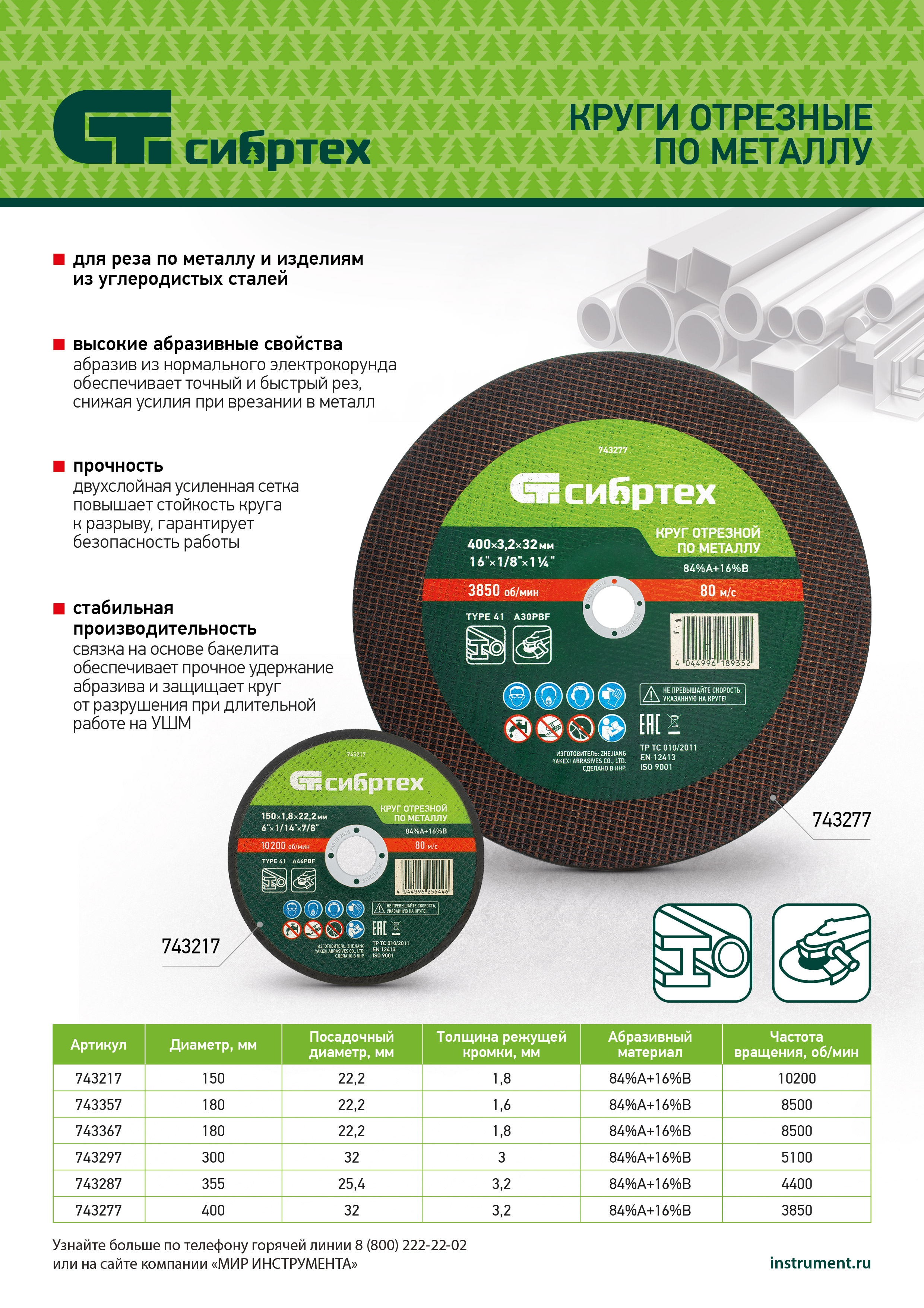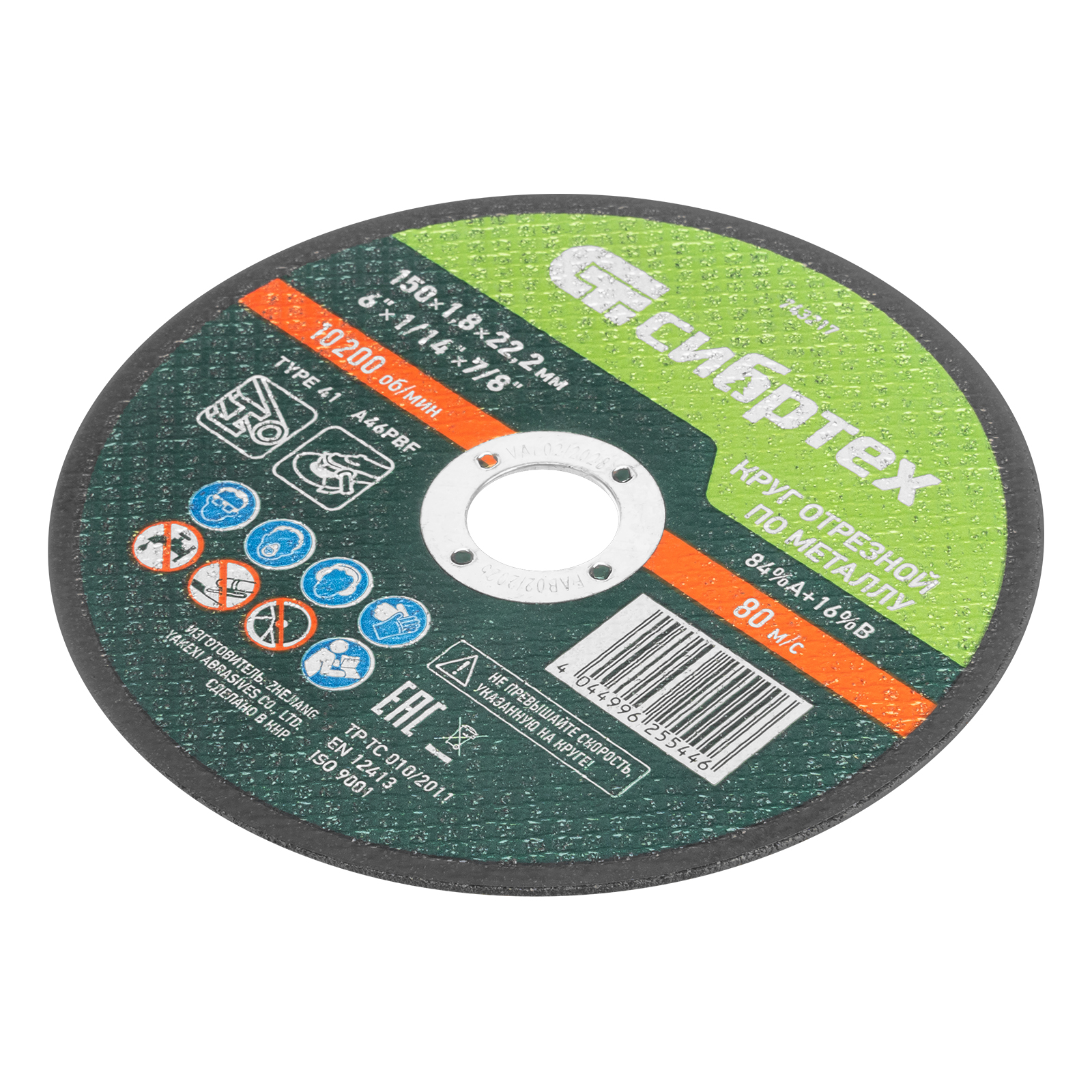Отрезной круг по металлу Сибртех 84%A+16%B 743217 диаметром 150 мм и толщиной 1,8 мм устанавливается на фланец ручной углошлифовальной машины с посадочным размером 22,2 мм. Предназначен для работы по металлу, оптимален для резания углеродистых сталей. Максимальная частота вращения составляет 10200 об/мин. Пригодится в мастерской, будет также полезен в быту.