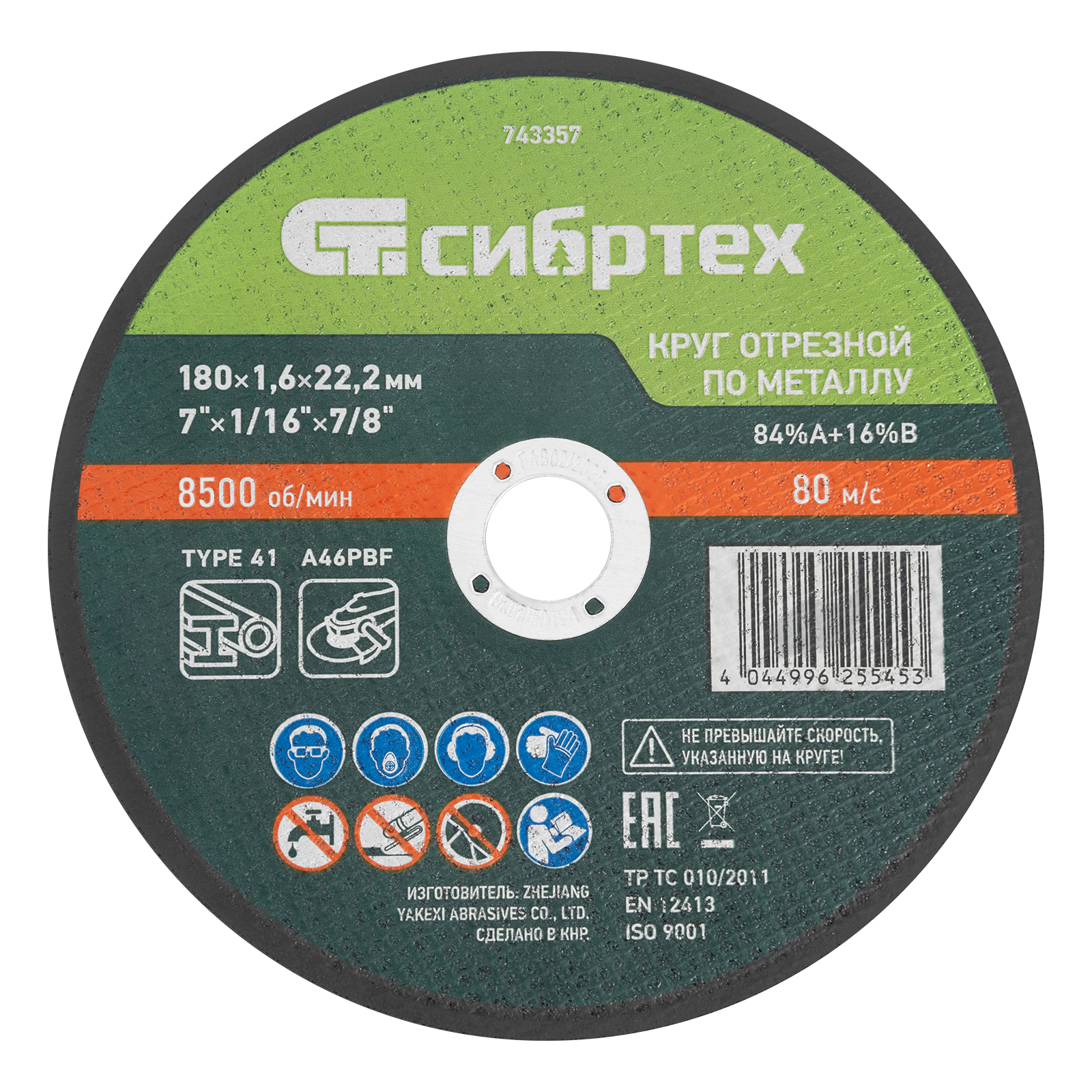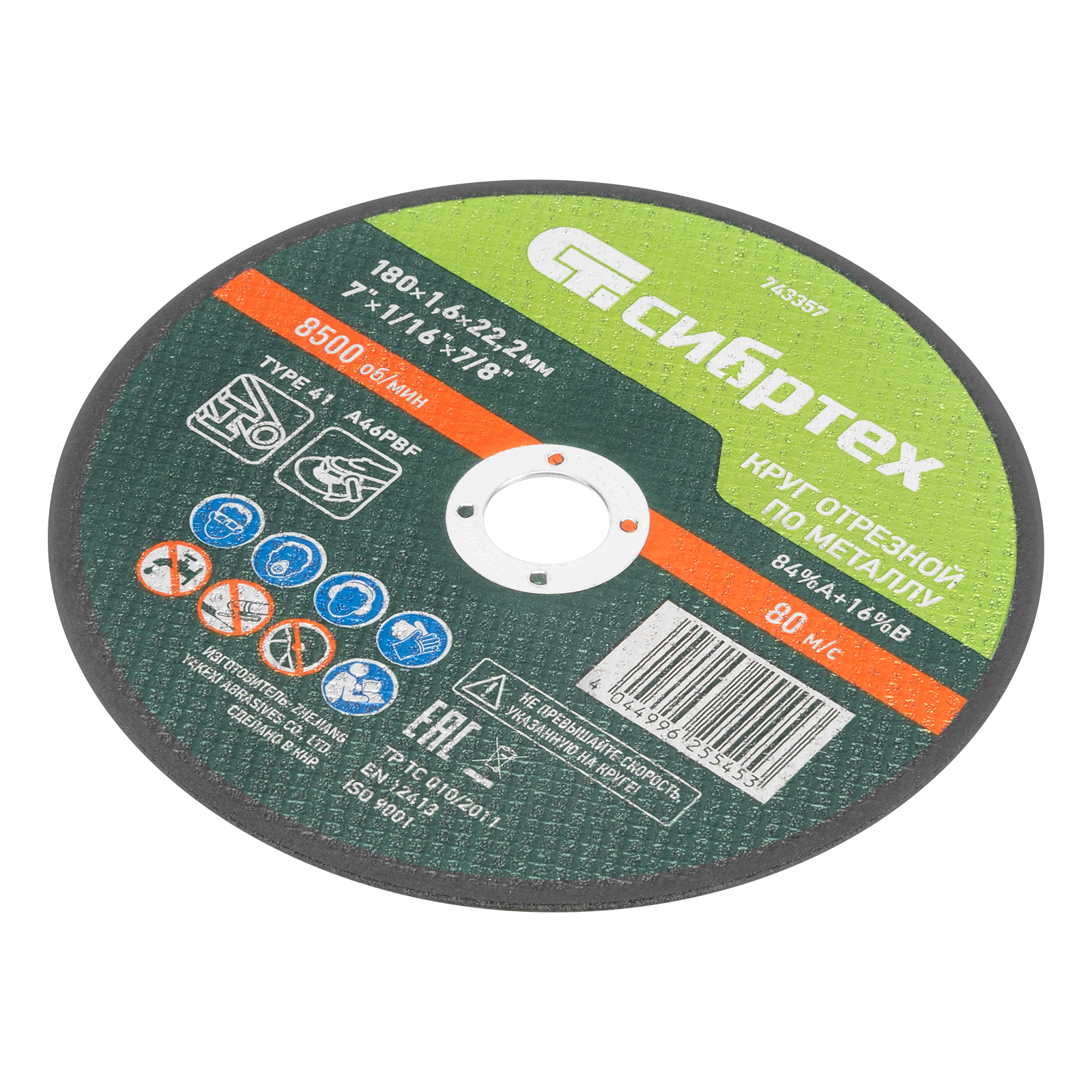 Отрезной круг по металлу Сибртех 84%A+16%B 743357 диаметром 180 мм и толщиной 1,6 мм устанавливается на фланец ручной углошлифовальной машины с посадочным размером 22,2 мм. Предназначен для работы по металлу, оптимален для резания углеродистых сталей. Максимальная частота вращения составляет 8500 об/мин. Пригодится в мастерской, будет также полезен в быту.