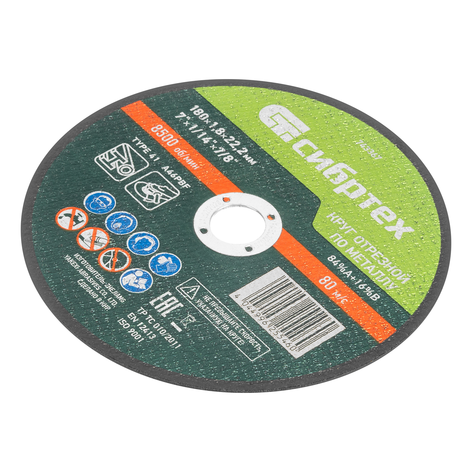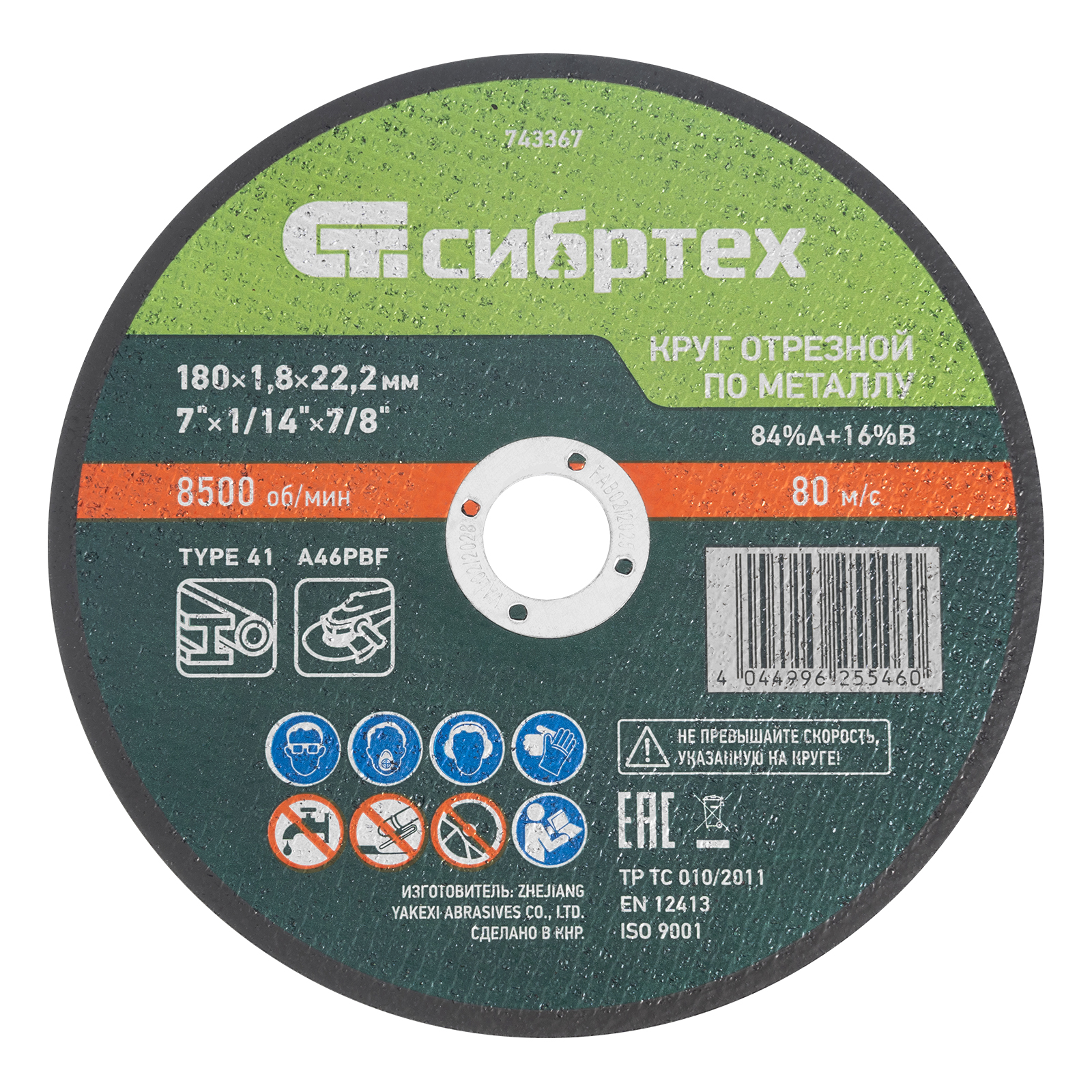 Отрезной круг по металлу Сибртех 84%A+16%B 743367 диаметром 180 мм и толщиной 1,8 мм устанавливается на фланец ручной углошлифовальной машины с посадочным размером 22,2 мм. Предназначен для работы по металлу, оптимален для резания углеродистых сталей. Максимальная частота вращения составляет 8500 об/мин. Пригодится в мастерской, будет также полезен в быту.