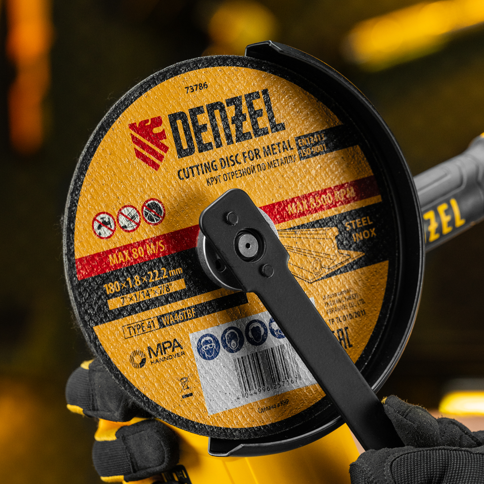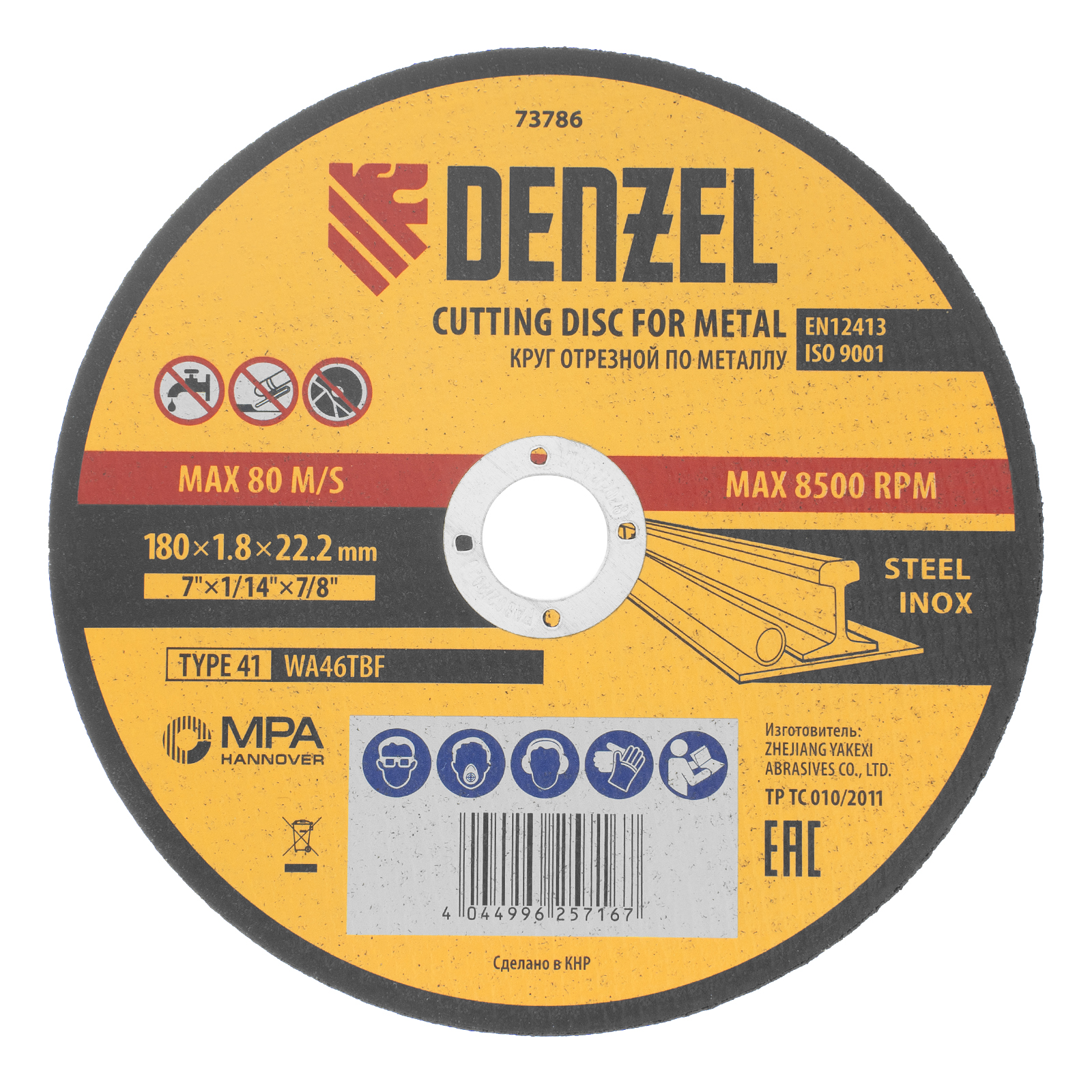 Отрезной круг по металлу Denzel WA46TBF 73786 диаметром 180 мм и толщиной 1,8 мм устанавливается на углошлифовальную машину с посадочным размером 22,2 мм. Предназначен для сухого резания углеродистых и нержавеющих сталей. Максимальная частота вращения составляет 8500 об/мин. Круг пригодится в слесарной мастерской.