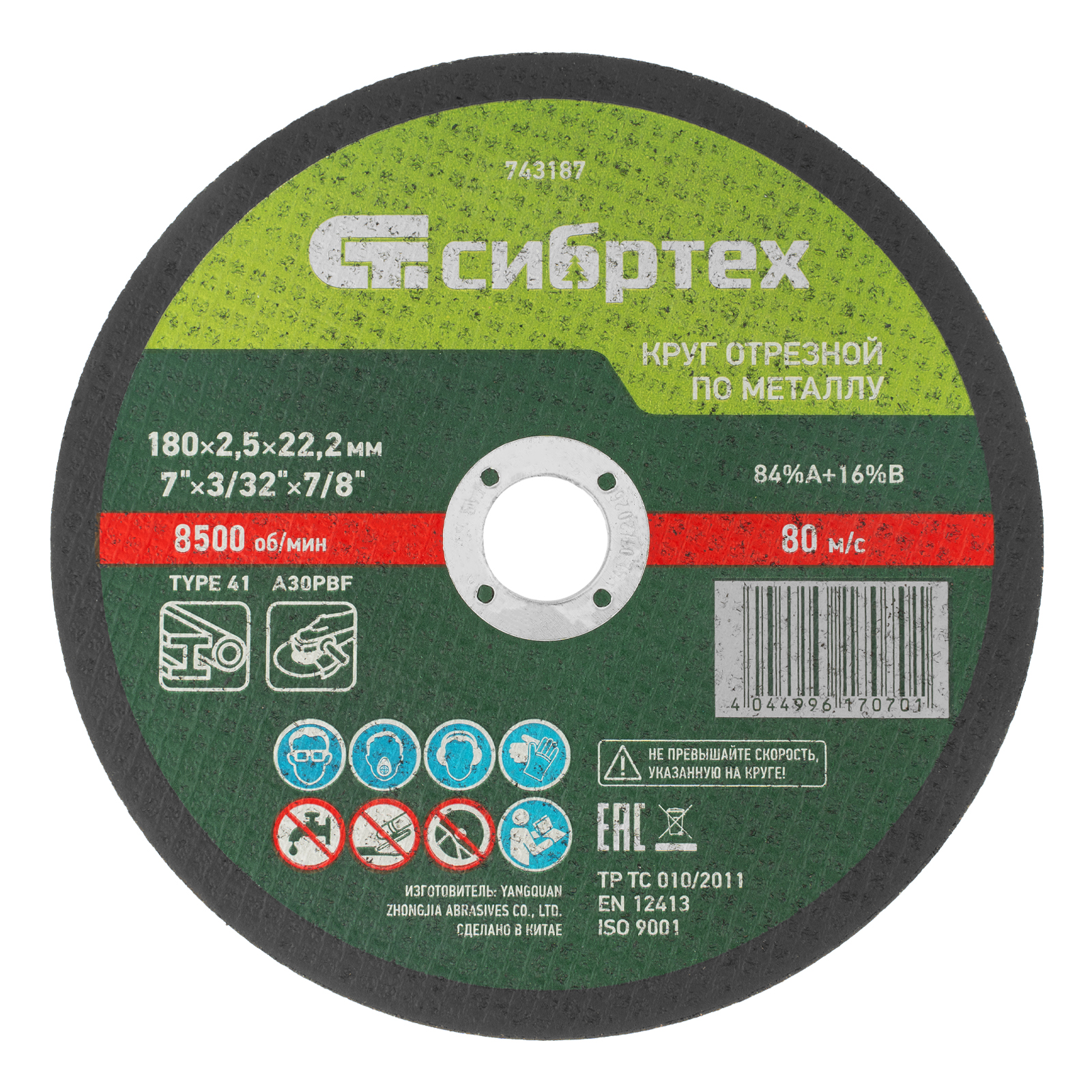 Отрезной круг по металлу Сибртех 84%A+16%B 743187 размером 180 х 2,5 мм устанавливается на фланец ручной углошлифовальной машины с посадочным размером 22,2 мм. Предназначен для резки углеродистых сталей. Круг пригодится частному мастеру для проведения ремонтных работ дома или в гараже.