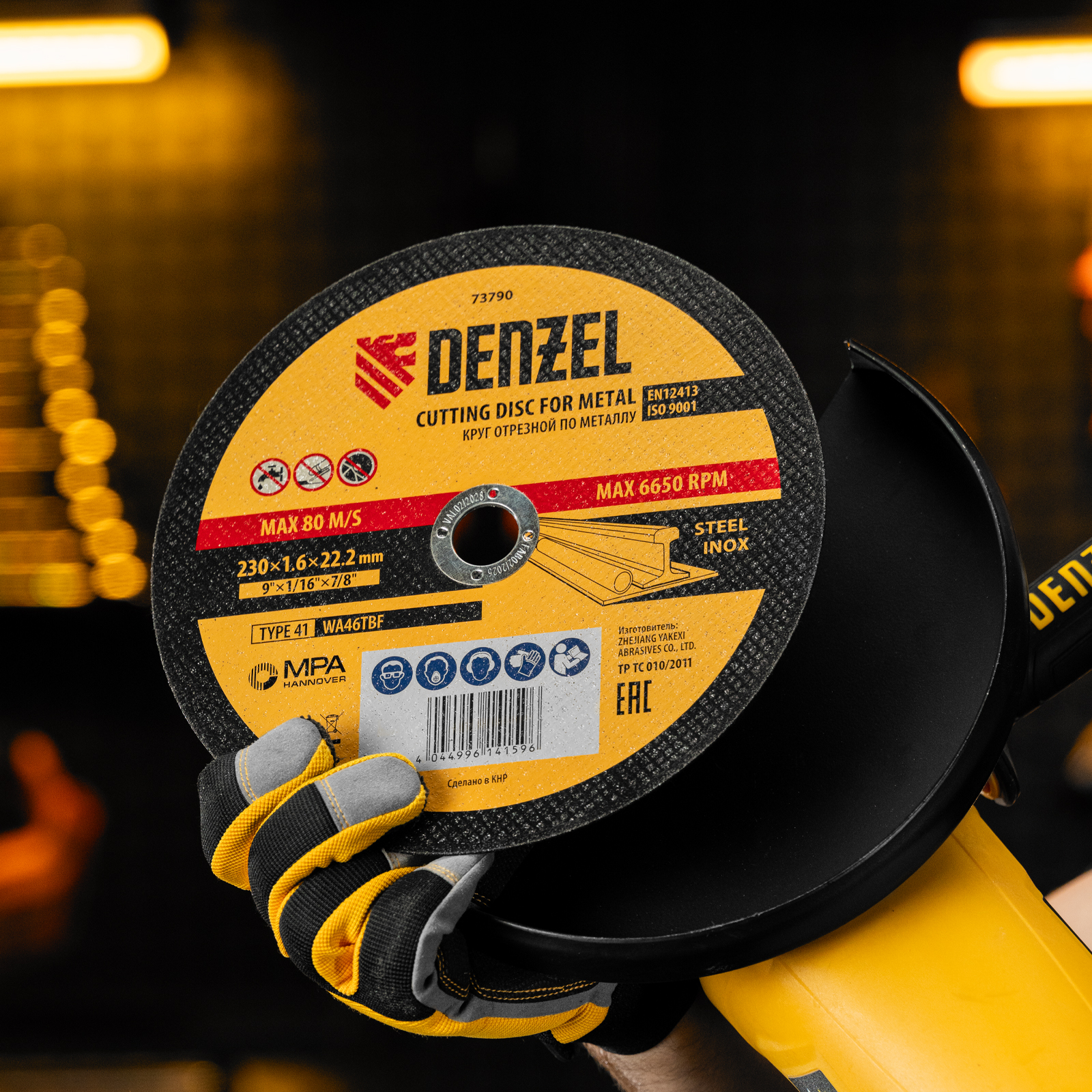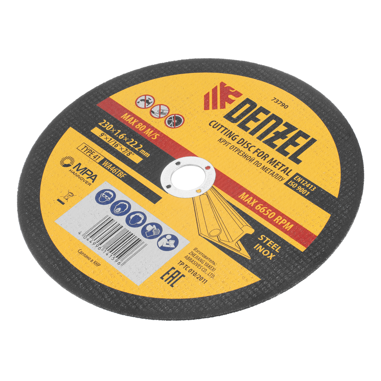 Отрезной круг по металлу Denzel WA46TBF 73790 диаметром 230 мм и толщиной 1,6 мм устанавливается на углошлифовальную машину с посадочным размером 22,2 мм. Предназначен для сухого резания углеродистых и нержавеющих сталей. Максимальная частота вращения составляет 6650 об/мин. Круг пригодится в слесарной мастерской.