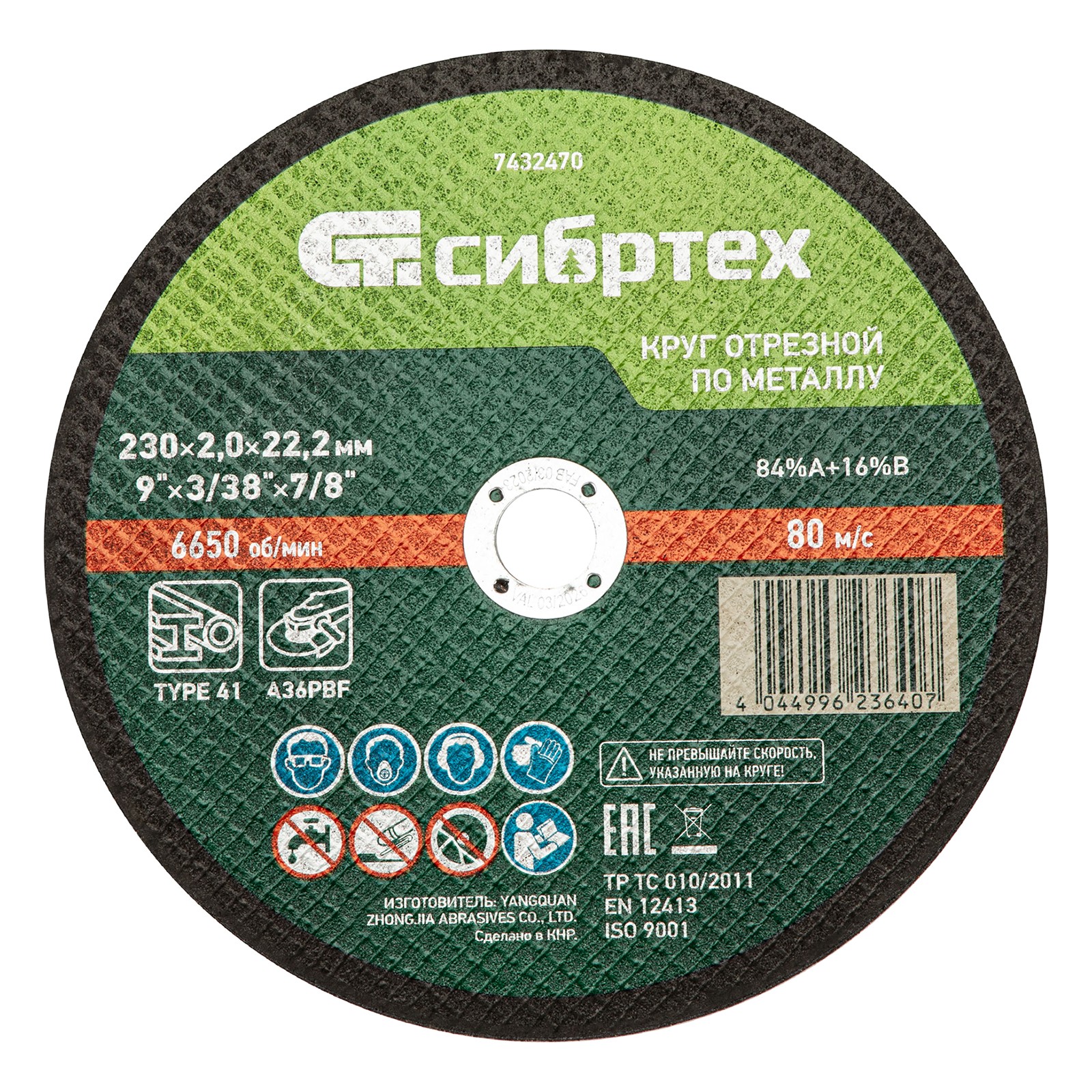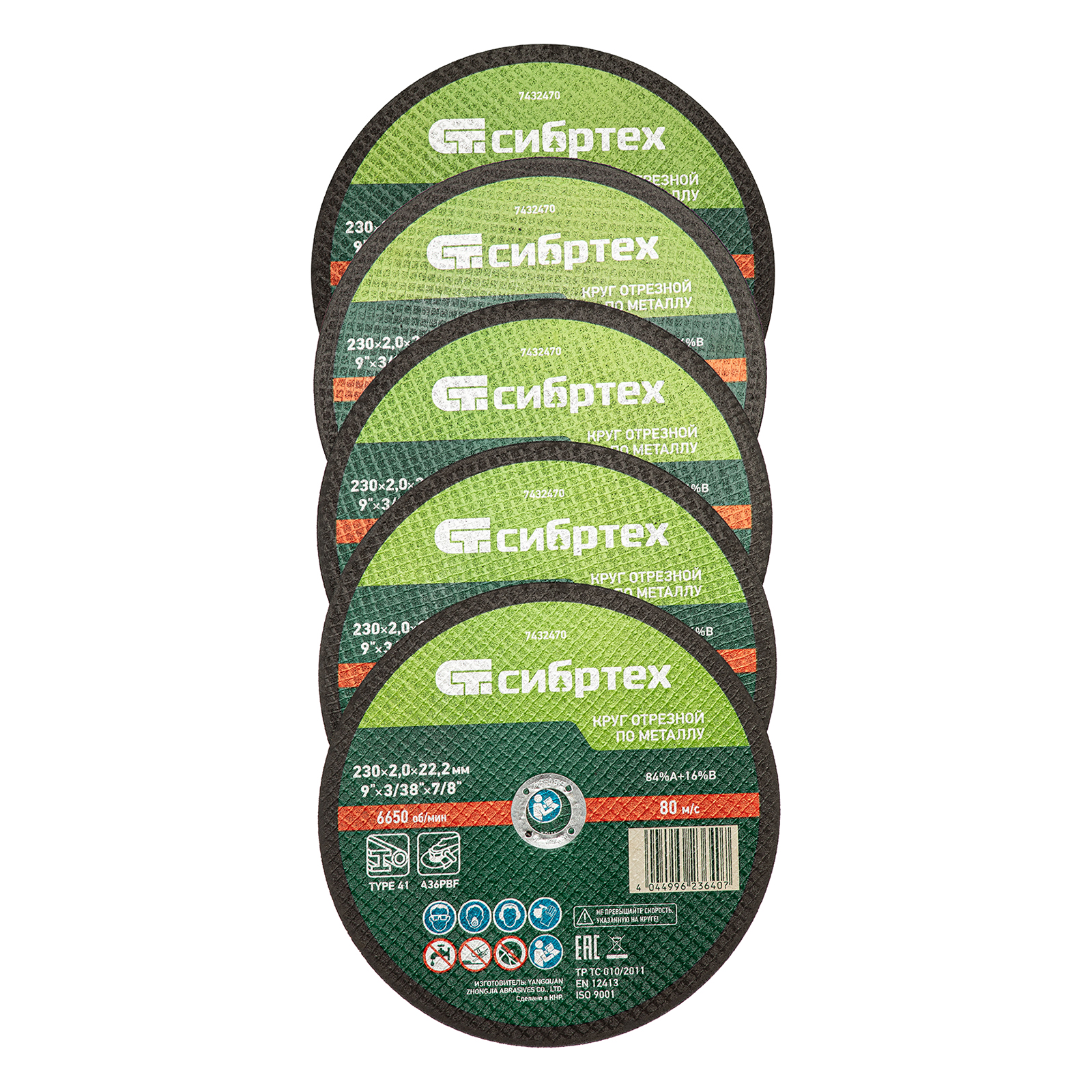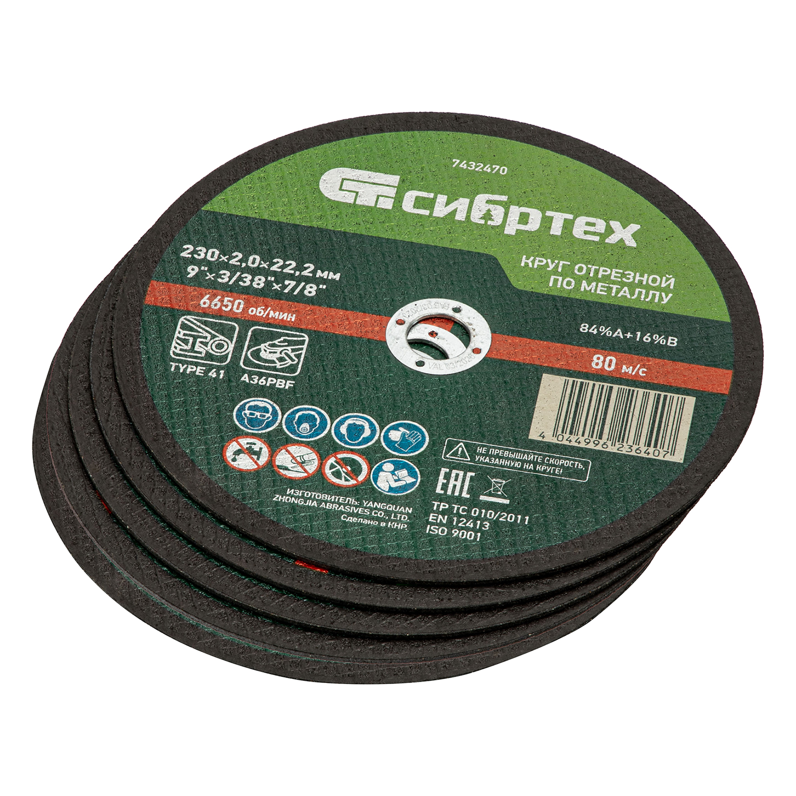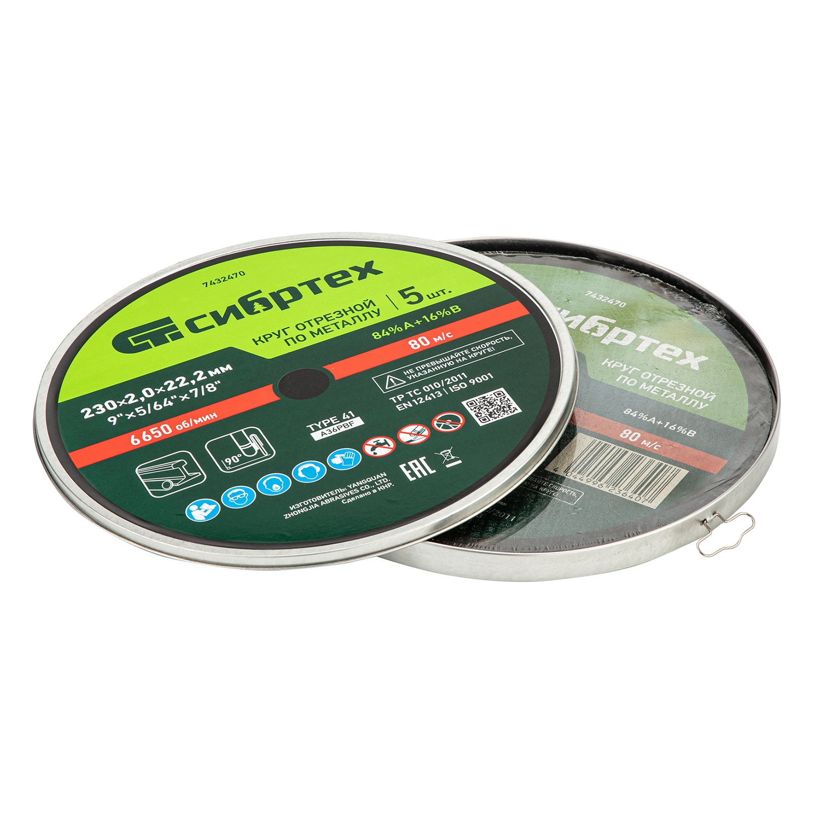 Круг отрезной по металлу Сибртех 84%A+16%B 7432470 диаметром 230 мм и толщиной 2,0 мм, 5 шт. в металлической банке, устанавливается на УШМ с посадочным размером 22,2 мм. Предназначен для резки углеродистых сталей. Набор пригодится частному мастеру для проведения ремонтных работ дома или в гараже, также подойдет для профессионального применения.