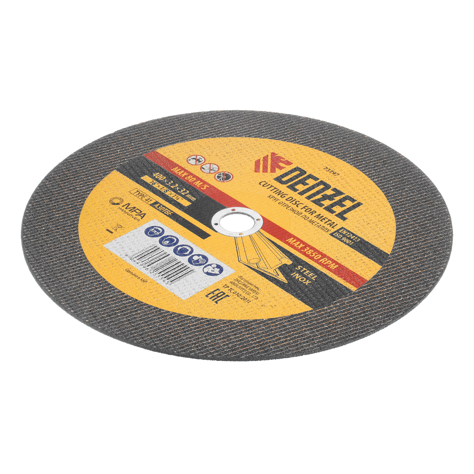 Отрезной круг по металлу Denzel A30TBF 73797 диаметром 400 мм и толщиной 3,2 мм устанавливается на углошлифовальную машину или станок с посадочным размером 32 мм. Предназначен для сухого резания углеродистых и нержавеющих сталей. Максимальная частота вращения составляет 3850 об/мин. Круг пригодится в слесарной мастерской.