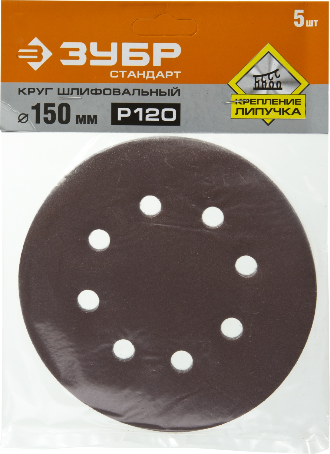 Круг шлифовальный ЗУБР ″СТАНДАРТ″ из абразивной бумаги на велкро основе, 6 отв., Р120, 150мм, 5шт