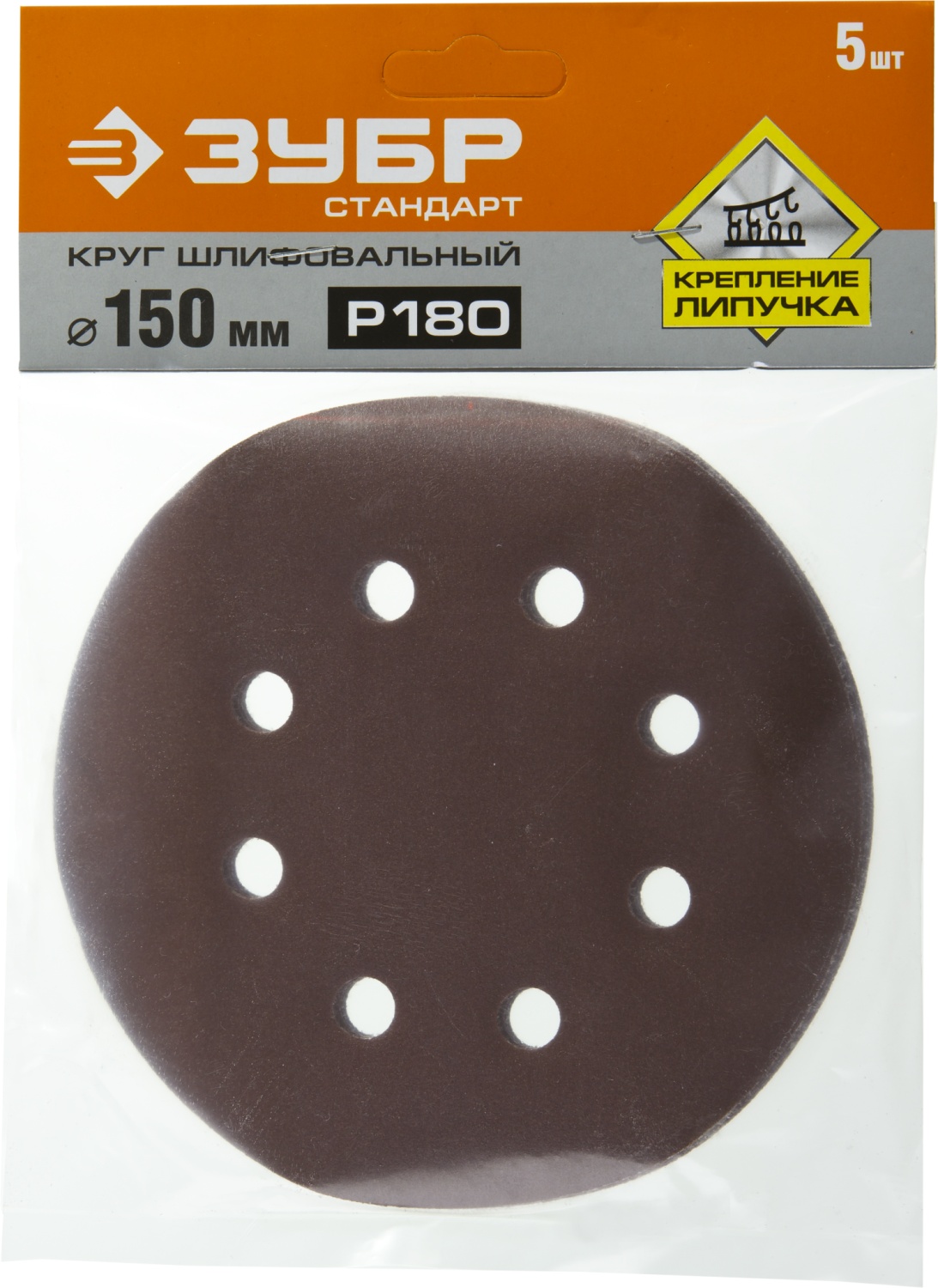 Круг шлифовальный ЗУБР ″СТАНДАРТ″ из абразивной бумаги на велкро основе, 6 отв., Р180, 150мм, 5шт