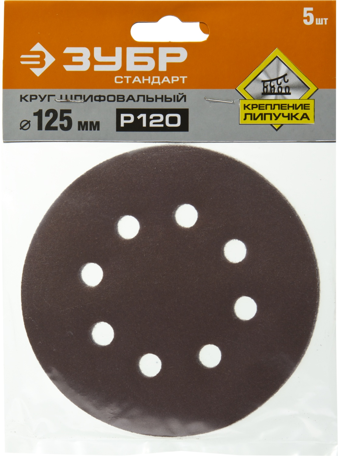 Круг шлифовальный ЗУБР ″СТАНДАРТ″ из абразивной бумаги на велкро основе, 8 отв., Р120, 125мм, 5шт