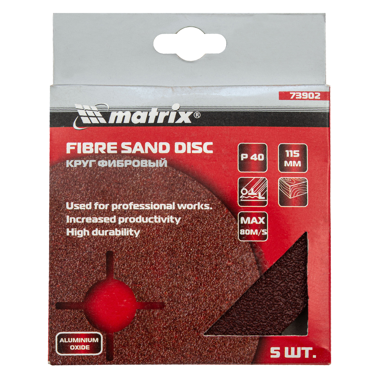 Фибровый круг Matrix 73902 размером 115 х 22 мм, с абразивом P 40, 5 шт. в упаковке, устанавливается на углошлифовальную машину (УШМ) при помощи опорной тарелки для фибровых кругов. Крупнозернистый абразив Р 40 используется для грубой обработки металлических, каменных и деревянных изделий, позволяет удалять лак, краску, заусенцы, ржавчину, затирать швы и устранять брызги после сварки. Благодаря прочной основе ресурс у фибровых кругов в 2-3 раза больше, чем у шлифкругов «под липучку».
