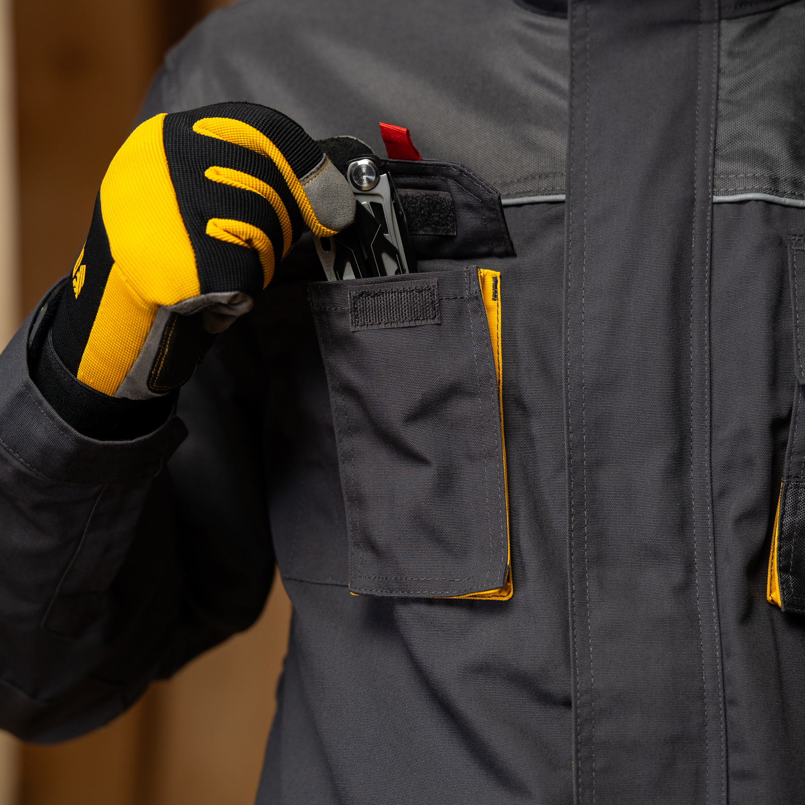 - 8 карманов — в больших карманах можно разместить различные инструменты, а в карманах на липучках — мобильный телефон и важные мелочи.