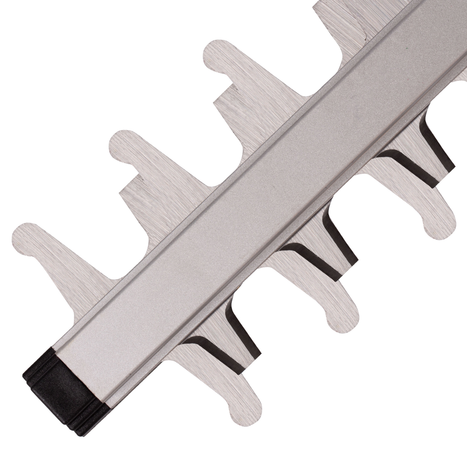 - Удобная работа под разным углом — рукоятку можно развернуть на 90 градусов влево и вправо для боковой подрезки кустарников, а для надежной фиксации предусмотрена кнопка блокировки поворота.