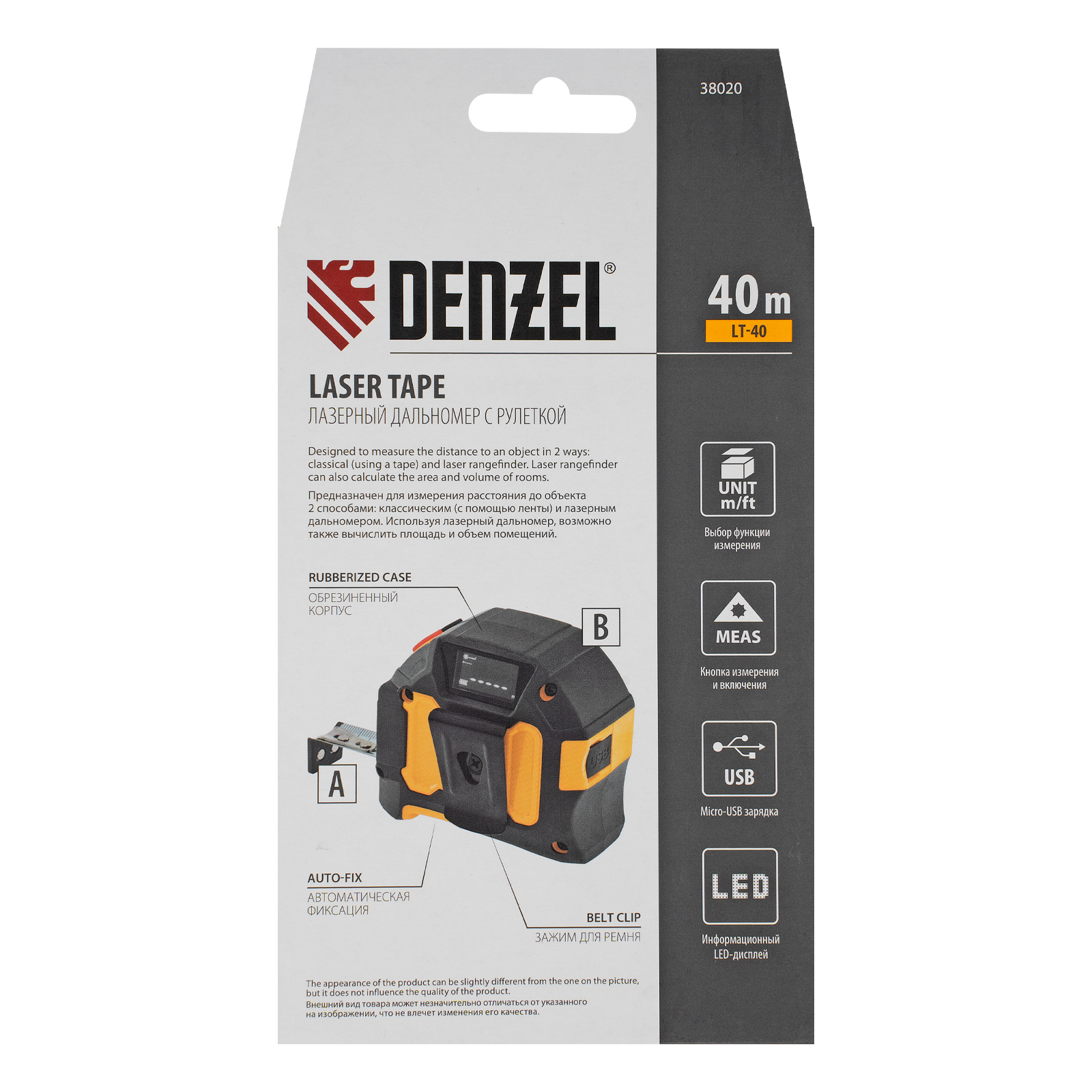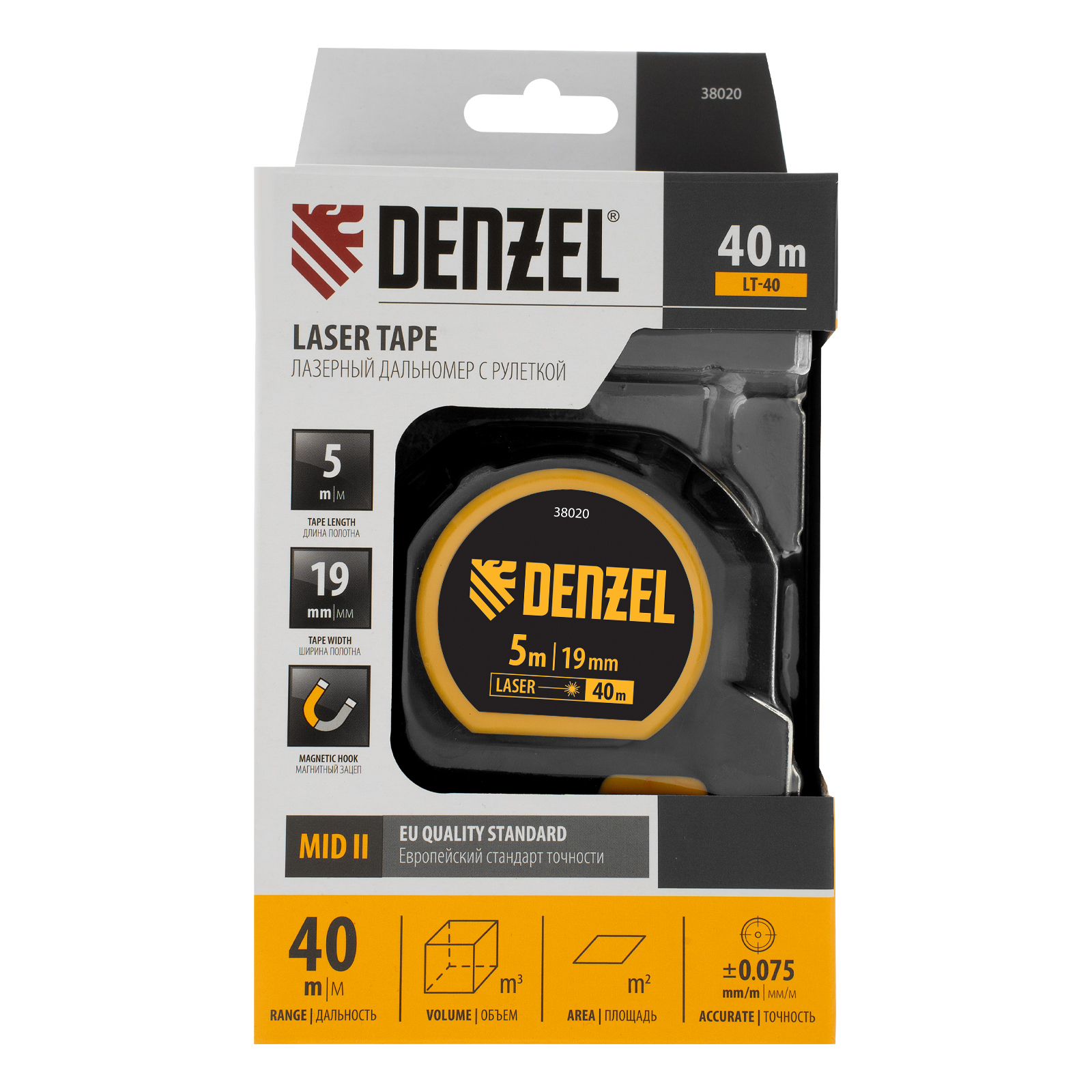 Лазерный дальномер с рулеткой Denzel LT-40 38020 — высокоточный многофункциональный инструмент для профессионалов и любителей. Предназначен для измерения расстояний от 0,2 до 40 метров при погрешности 0,075 мм/м, а также для определения площади и объема помещения. В инструмент интегрирована гибкая механическая рулетка длиной 5 метров, повышающая точность измерений. Li-Ion аккумулятор емкостью 380 мА·ч обеспечивает длительное время работы.