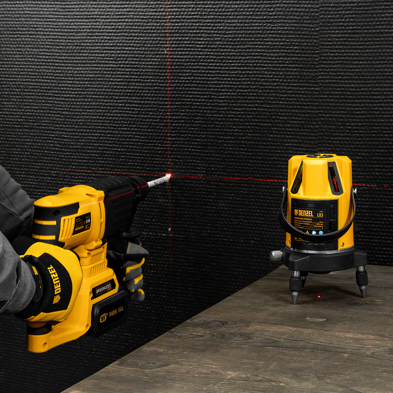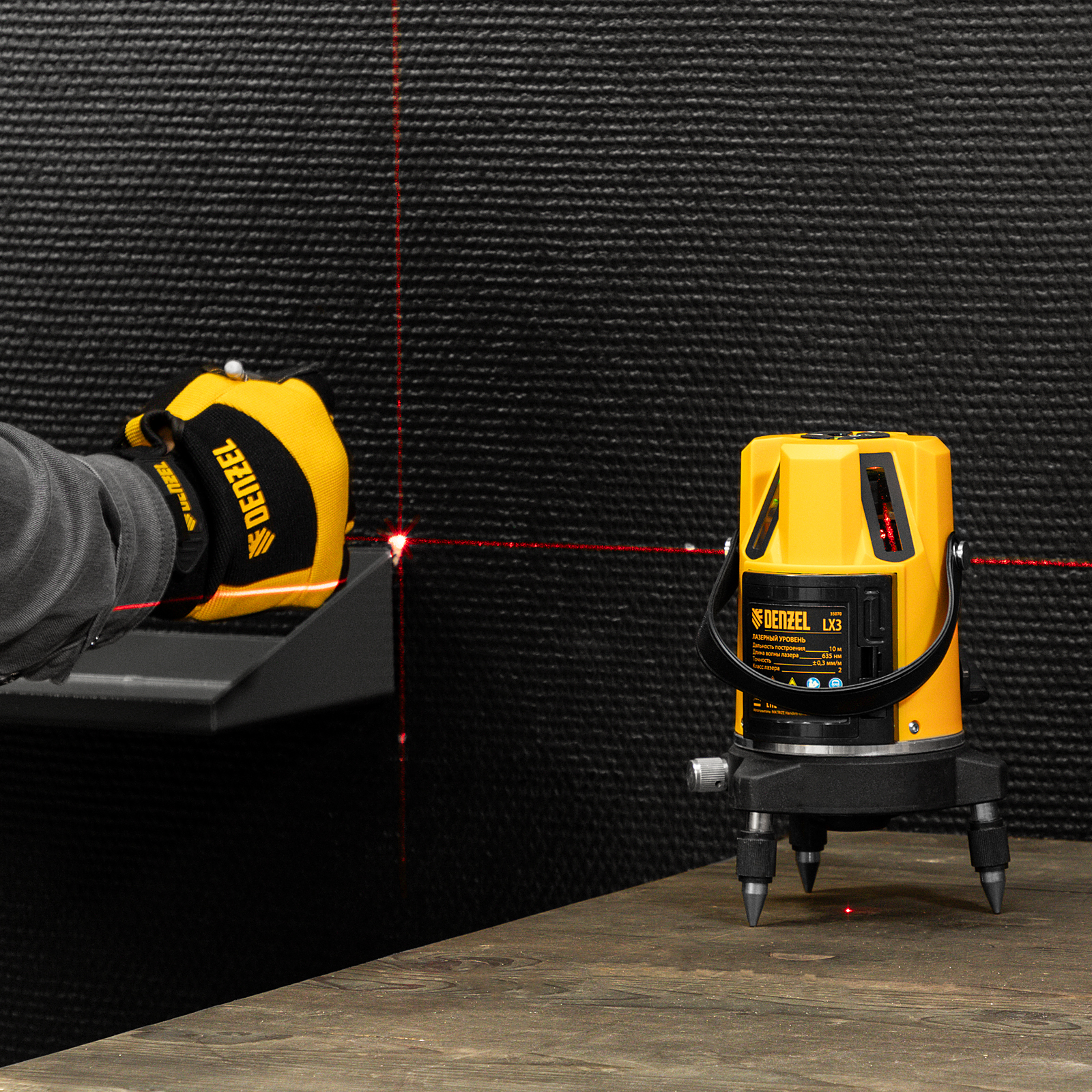 Лазерный уровень Denzel LX3 35070 с резьбой 5/8" под штатив имеет точность ±0,3 мм/1 м и проецирует точку отвеса, 4 вертикальных и 1 горизонтальную линию на расстояние до 10 м при помощи красных лучей 635 нм. Используется для построения разметки на стенах, полу и потолке. Пригодится во время укладки плитки, монтажа подвесных потолков, установки оконных рам, а также проведения других ремонтных и отделочных работ.