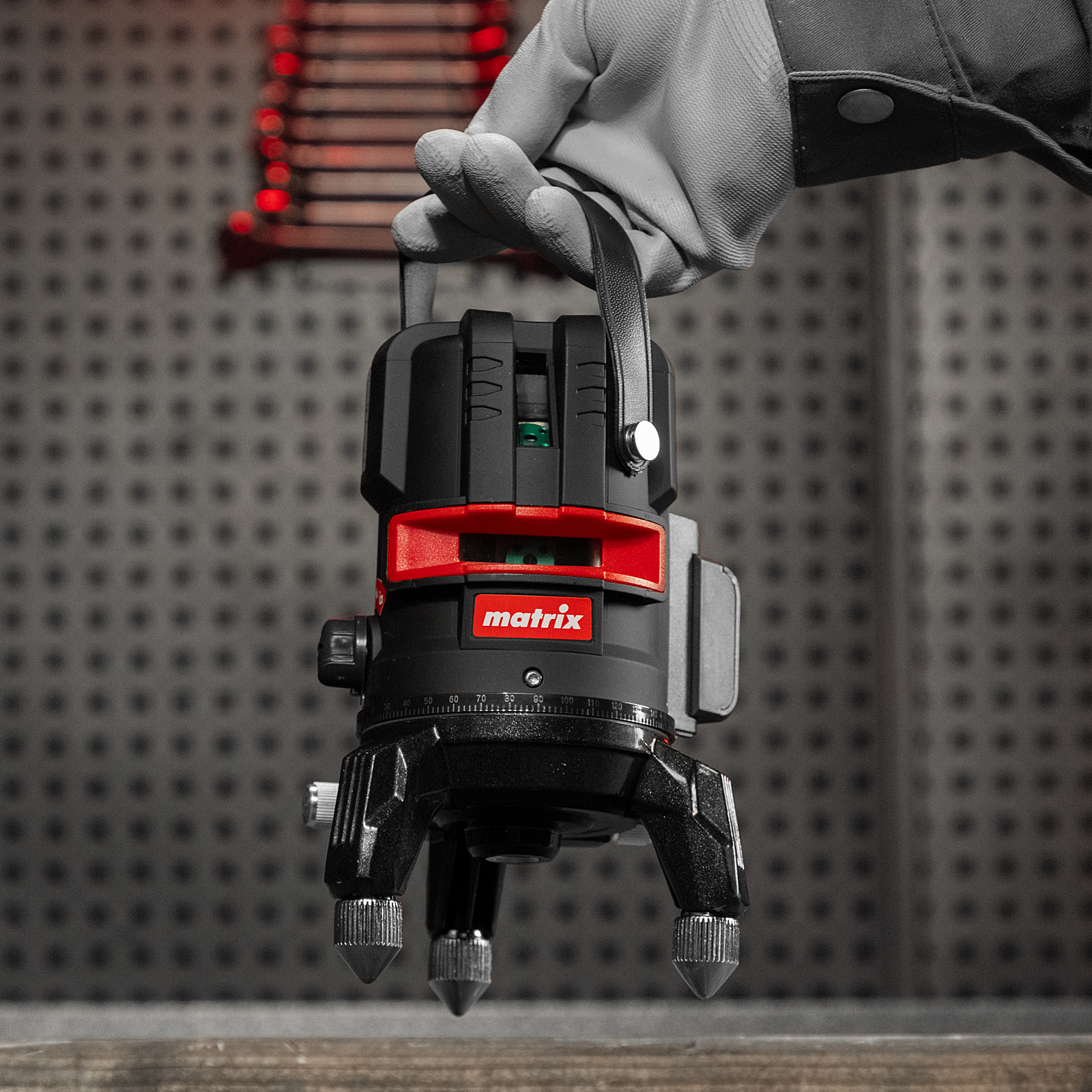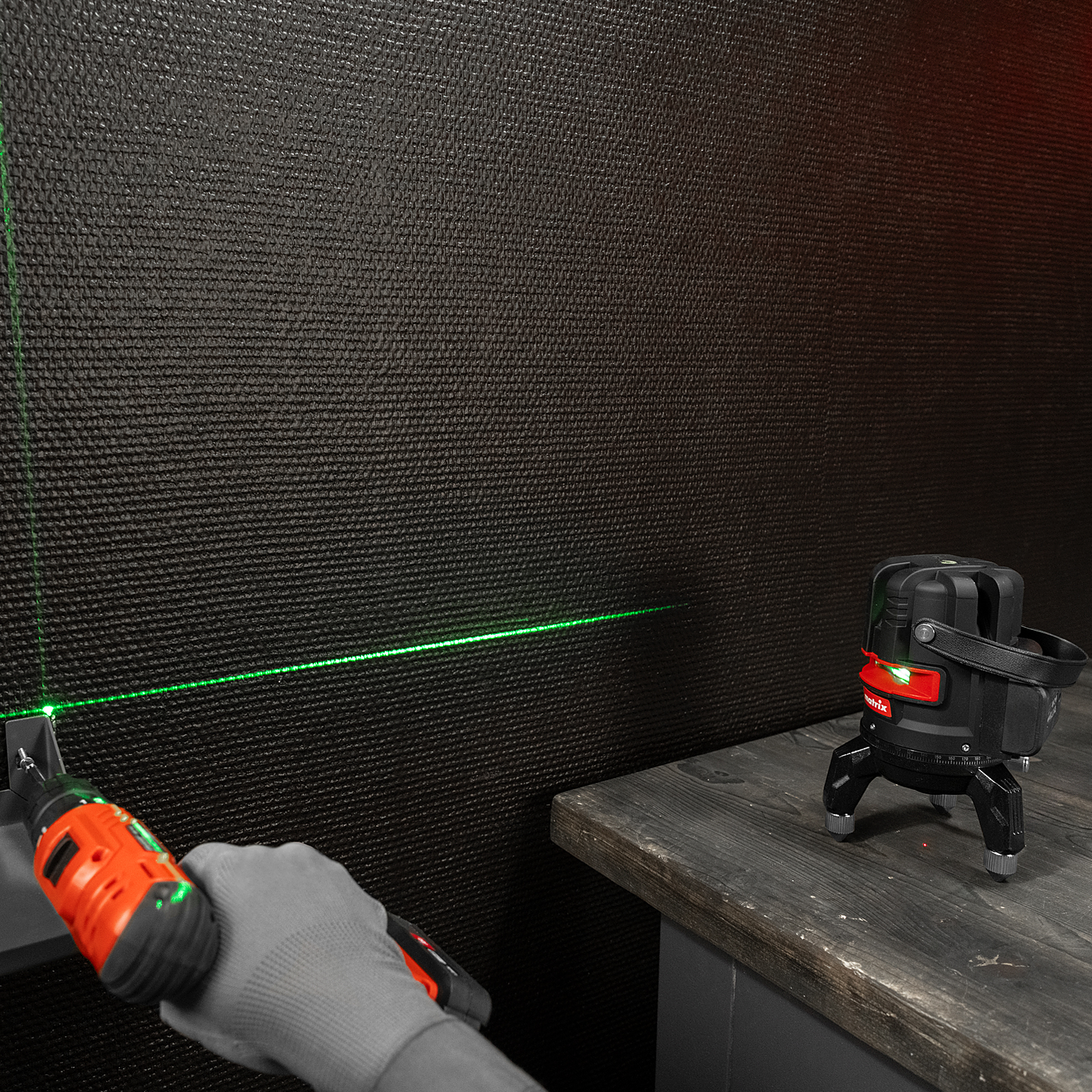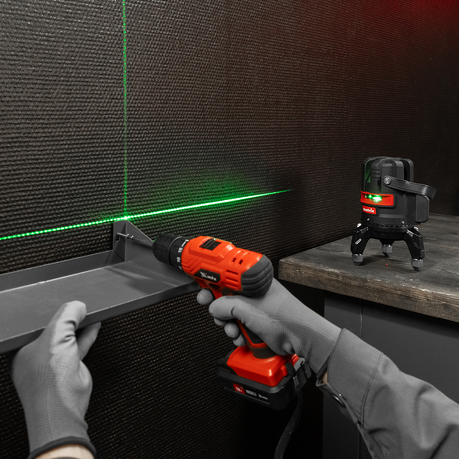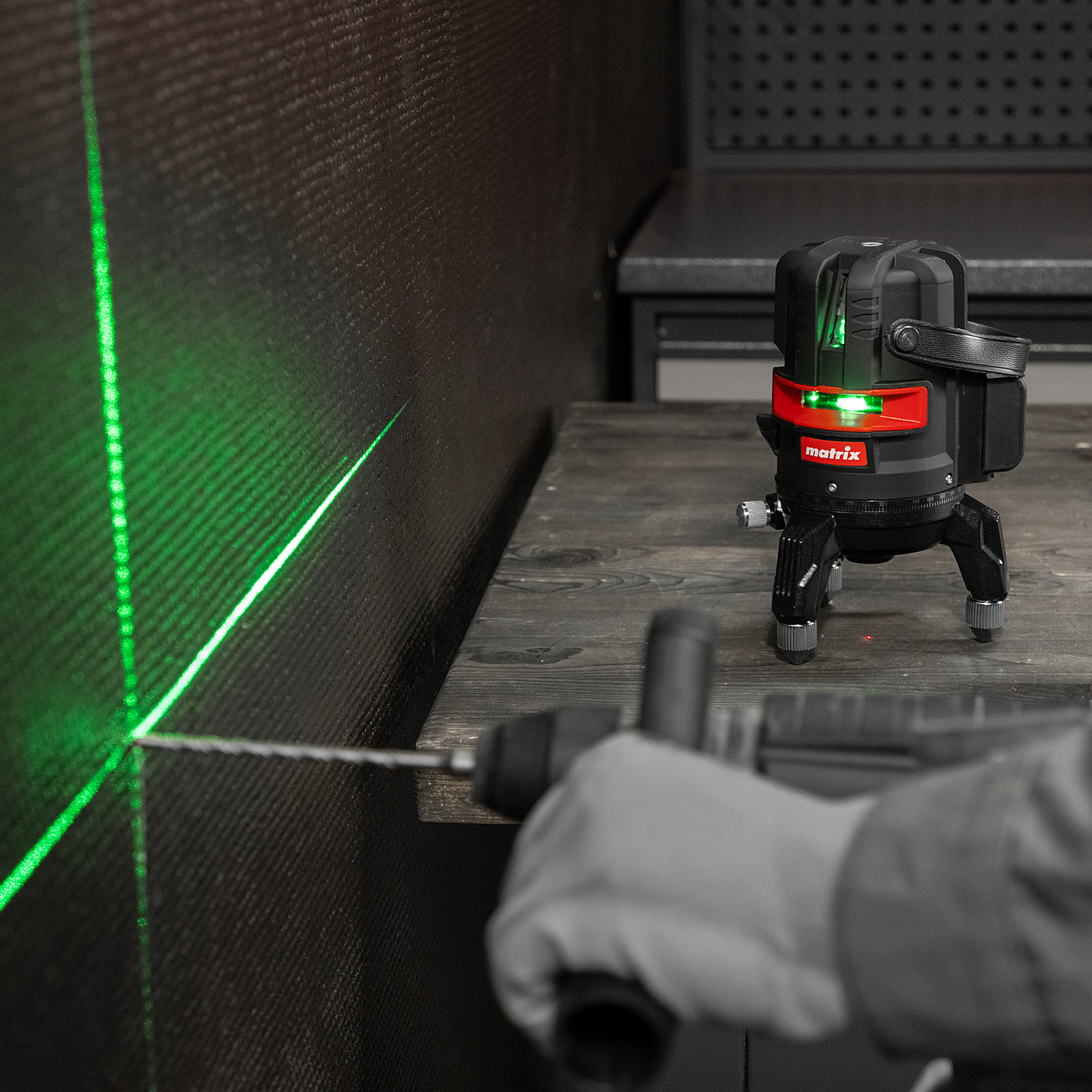 Лазерный уровень Matrix ML 05 Green 35067 с резьбой 5/8" под штатив питается от аккумулятора Li-Ion 2800 мА/ч и проецирует горизонтальную и вертикальные линии, а также точку отвеса на расстоянии до 30 м при помощи зеленых лучей длиной 520 нм. С его помощью можно легко разметить все стены в помещении, чтобы ровно уложить кирпич и плитку, установить окна и двери, смонтировать подвесной потолок.