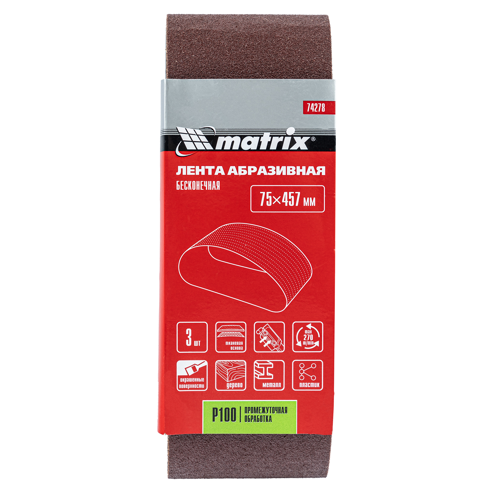 Бесконечная абразивная лента Matrix 74278 с зернистостью P 100, 3 шт. в упаковке, устанавливается на ленточную шлифовальную машину, совместимую со сменными элементами размером 75 х 457 мм. Применяется для чистовой обработки деревянных и металлических поверхностей, снятия тонкого слоя краски, ржавчины, удаления мелких заусенцев.