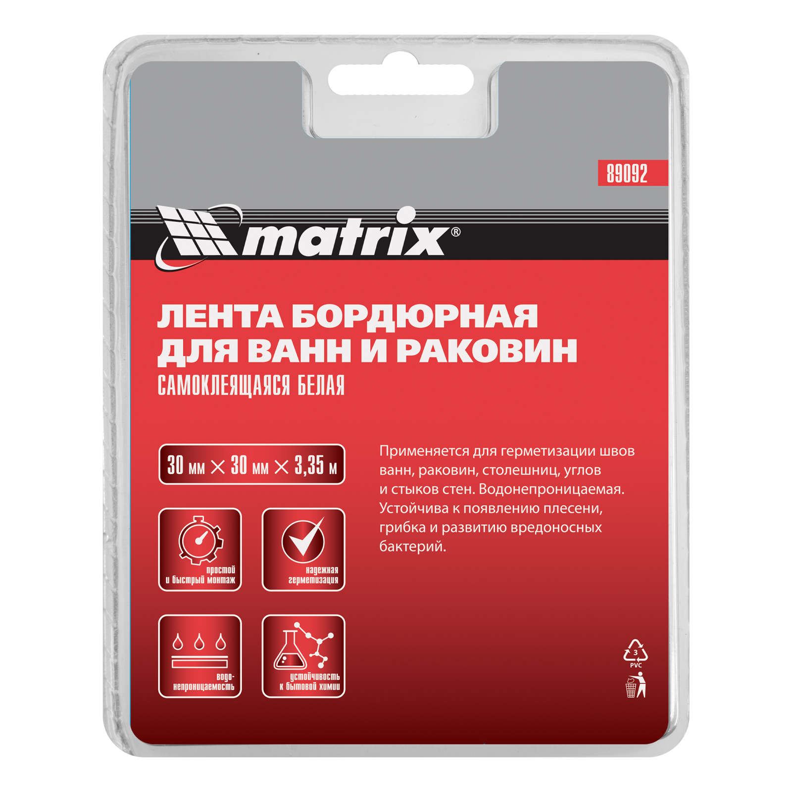Бордюрная лента Matrix 89092 размером 30 мм х 30 мм х 3,35 м используется для герметизации швов ванн, раковин, столешниц, подходит для фиксации в углах и стыках стен. Надежно фиксируется на глянцевых поверхностях и выдерживает эксплуатацию в условиях повышенной влажности.