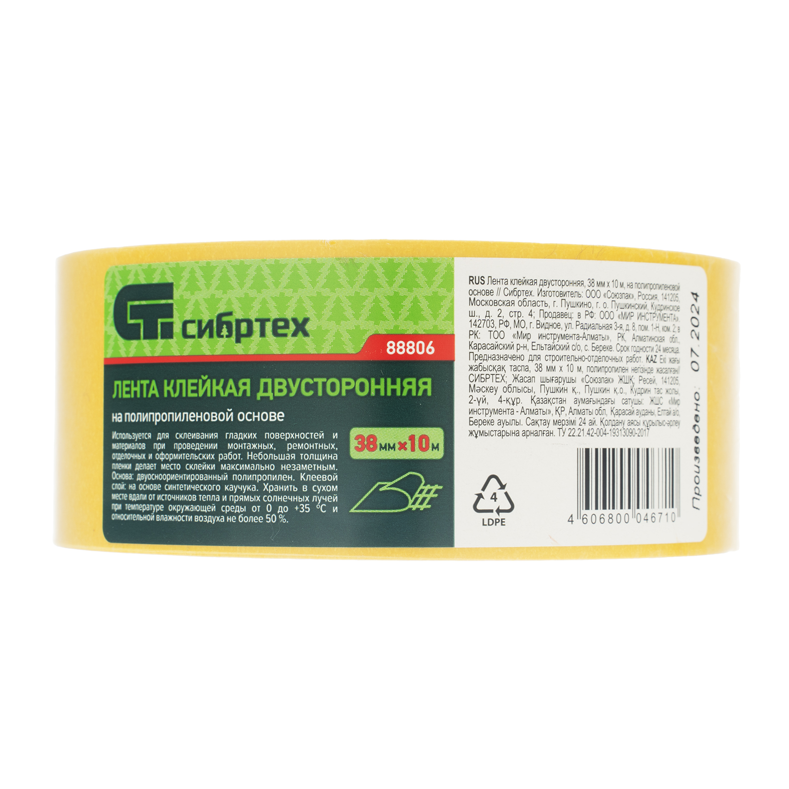 Клейкая двусторонняя лента Сибртех 88806 размером 38 мм х 10 м, на полипропиленовой основе, надежно крепится к горизонтальным и вертикальным поверхностям, которые не подвергаются сильным механическим нагрузкам. Благодаря высоким адгезионным свойствам лента подходит для работы с самыми разными материалами: картоном, деревом, пластиком, резиной, стеклом, металлом. Пригодится для занятий дизайном, а также решения различных задач в быту.