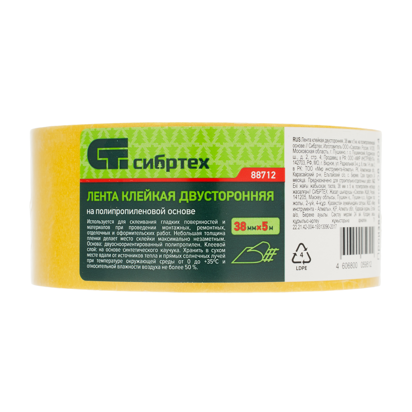 Клейкая двусторонняя лента Сибртех 88712 размером 38 мм х 5 м, на полипропиленовой основе, надежно крепится к горизонтальным и вертикальным поверхностям, которые не подвергаются сильным механическим нагрузкам. Благодаря высоким адгезионным свойствам лента подходит для работы с самыми разными материалами: картоном, деревом, пластиком, резиной, стеклом, металлом. Пригодится для занятий дизайном, а также решения различных задач в быту.
