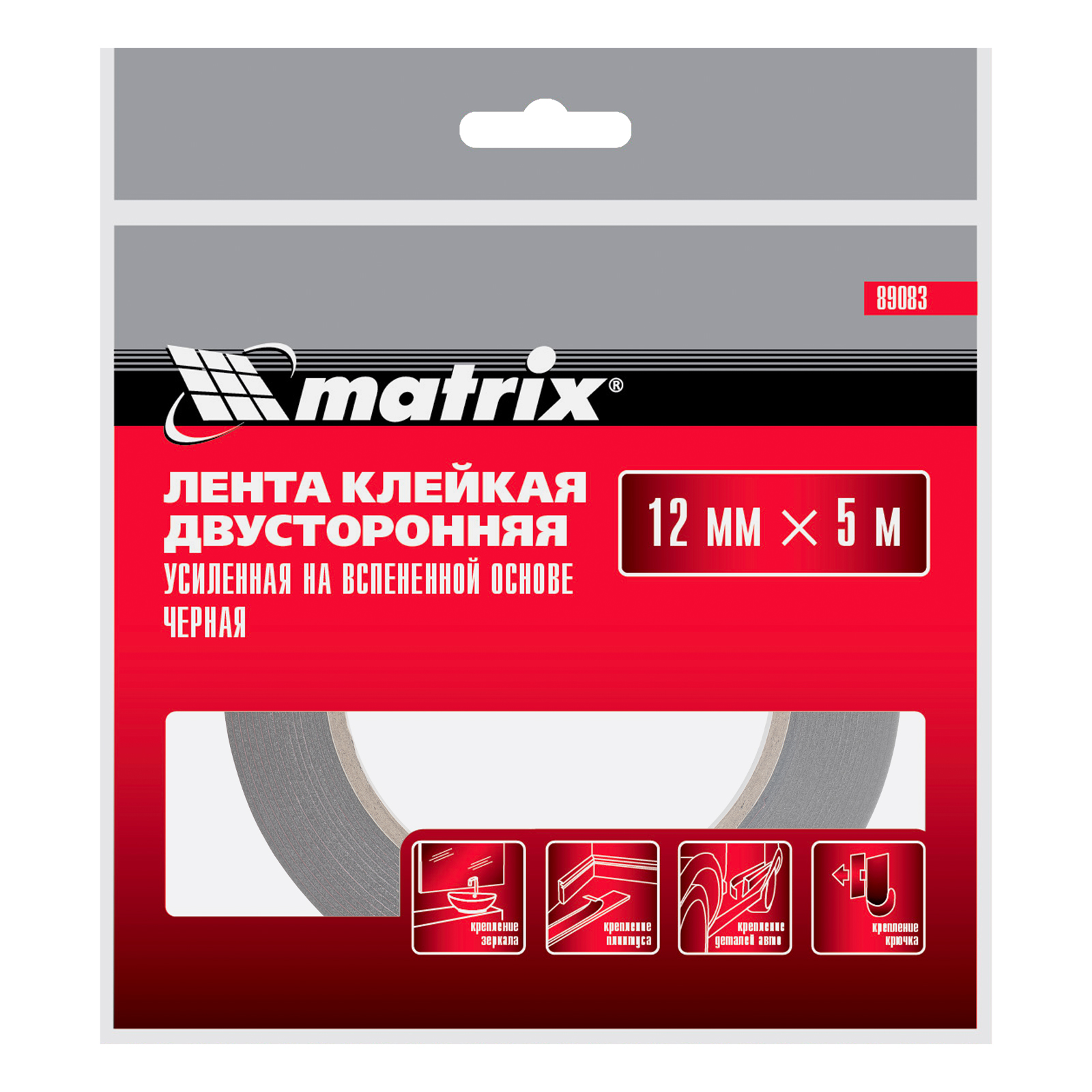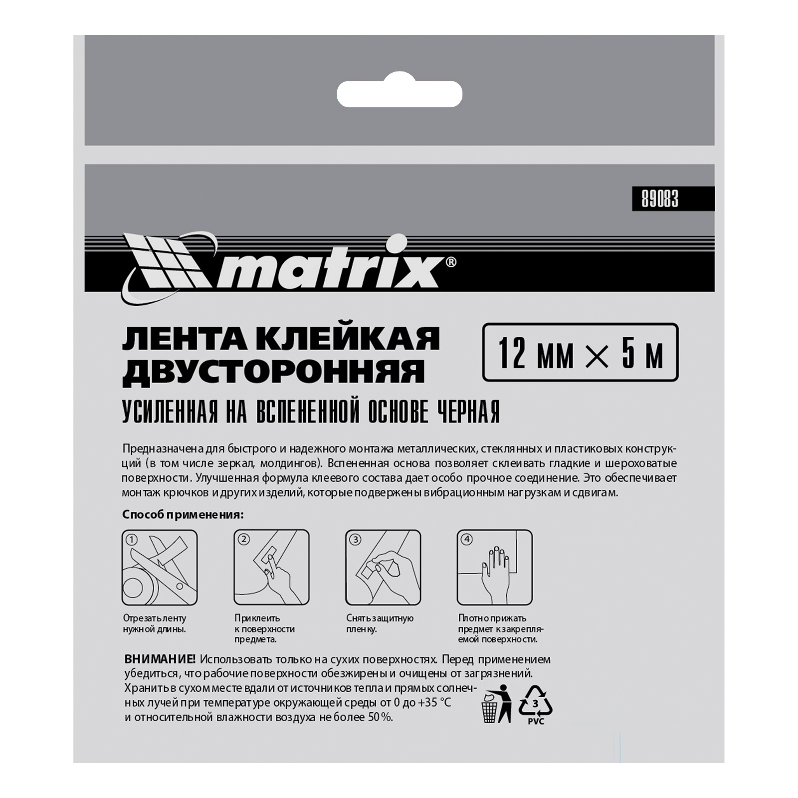 Усиленная двусторонняя клейкая лента Matrix 89083 на вспененной основе, размером 12 мм х 5 м, черного цвета, надежно соединяет ровные и шероховатые поверхности без риска их повреждения. Подходит для склеивания предметов из металла, пластика, картона, керамики, стекла. Пригодится в ходе проведения ремонтных, монтажных работ, а также для занятий рукоделием. Лента может использоваться для монтажа предметов, подвергающихся вибронагрузкам и сдвигам: автомобильных молдингов, зеркал, крючков и т.д.