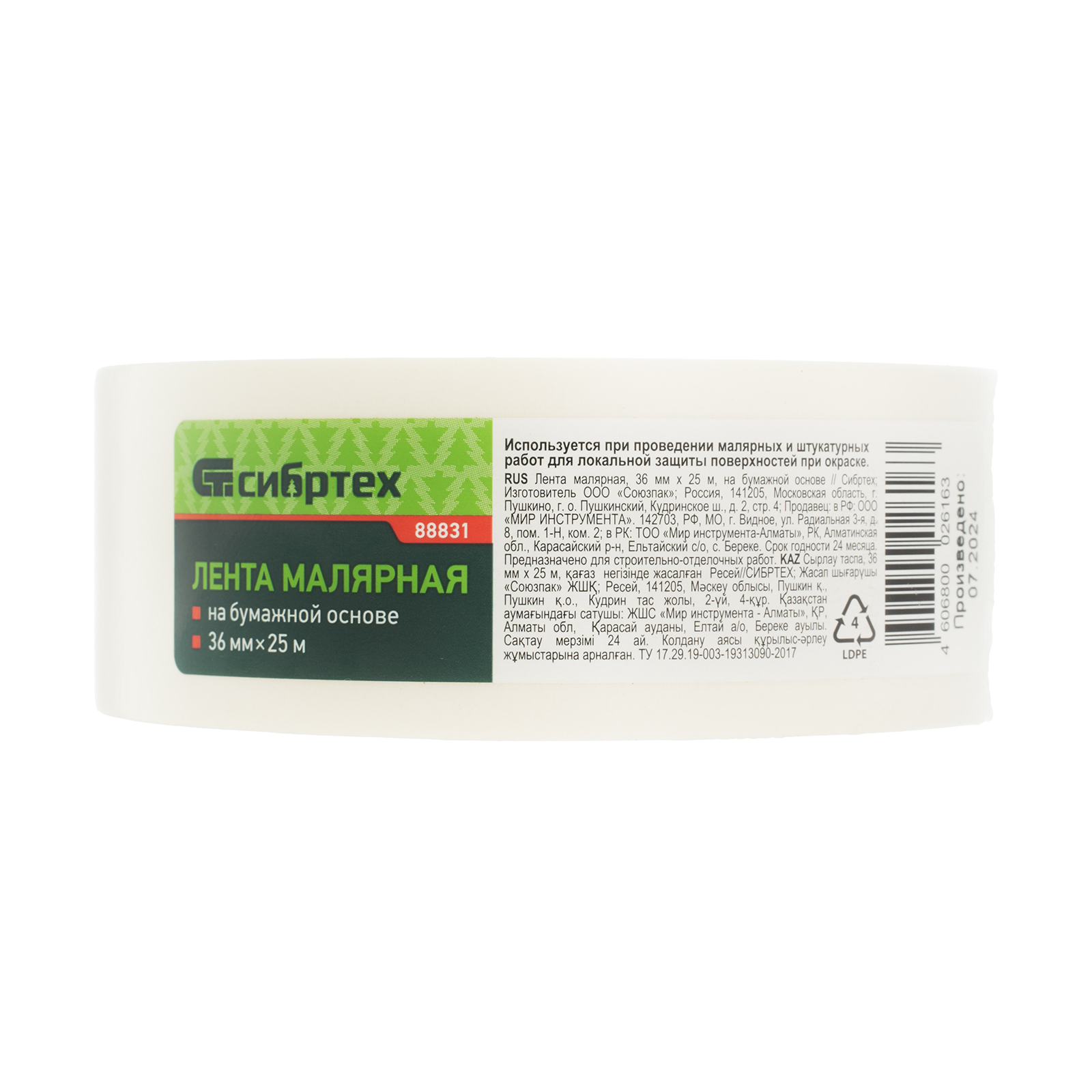 <p>Малярная лента Сибртех 88831 шириной 36 мм и длиной намотки 25 м, на бумажной основе, пригодится для внутренних малярных работ с ЛКМ любого типа, а также для склеивания книг, альбомов и других бумажных предметов. Повышает качество окрашивания, т.к. предотвращает растекание краски, при этом надежно клеится и без труда удаляется, не оставляя следов на поверхностях.</p><h2>Преимущества</h2><ul><li>Удобное использование — благодаря бумажной основе на ленте можно делать пометки при необходимости.</li><li>Экологичность — лента намотана на картонно-бумажную втулку, утилизация которой безвредна для окружающей среды.</li><li>Длина 25 м — одной намотки хватит для решения большого объема задач.</li><li>Надежная упаковка — лента поставляется в термоусадочной пленке для бережной транспортировки.</li></ul>