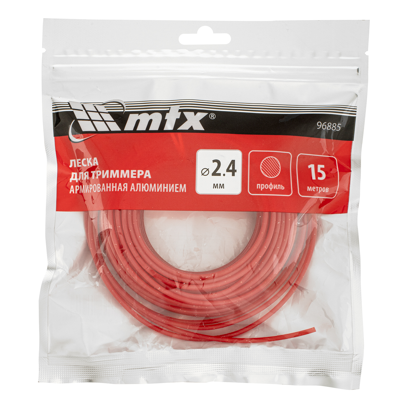 Леска для триммера MTX 96885 круглого сечения, диаметром 2,4 мм и длиной 15 м, армированная алюминием, эффективно срезает как молодую, газонную, так и высокую, жесткую траву. Совместно с бензиновым триммером позволяет привести в порядок загородный участок, придомовую территорию и т.д.