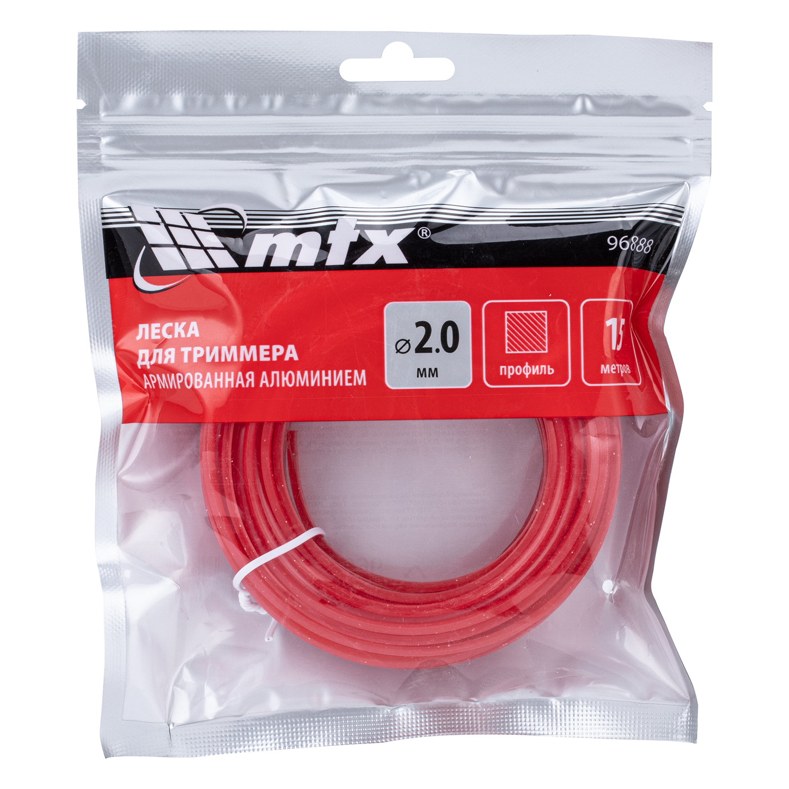<p>Леска для триммера MTX 96888 с сечением «квадрат», толщиной 2,0 мм и длиной 15 м, армированная алюминием, эффективно срезает как молодую, газонную, так и высокую, жесткую траву. Совместно с электрическим триммером мощностью 1000-1500 Вт позволяет привести в порядок территорию загородного участка.</p><h2>Преимущества</h2><ul><li>Повышенная износостойкость — леска изготовлена из полиамида, содержащего микрочастицы алюминия, что значительно увеличивает ее прочность и устойчивость к нагрузкам.</li><li>Высокая производительность — благодаря острым граням корд обеспечивает быстрый и ровный рез, трава не желтеет после скашивания.</li><li>Длина 15 м — одной намотки хватит надолго.</li></ul>