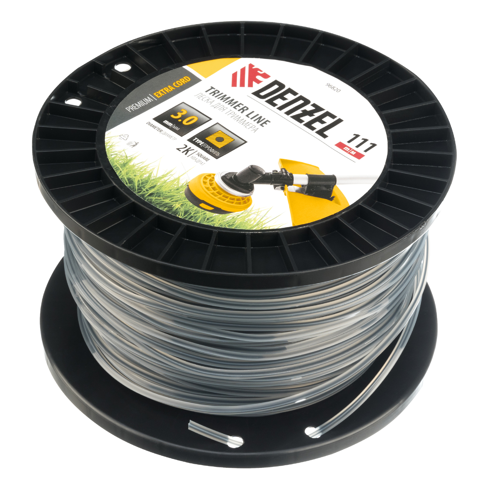 Двухкомпонентная леска для триммера Denzel EXTRA CORD 96820 размером 3,0 мм х 111 м, с сечением «квадрат», на DIN-катушке, используется для скашивания густых зарослей травы и сорных растений на дачном участке и придомовой территории. Заправляется в катушку бензокос с объемом двигателя 25-52 см3. Благодаря острым граням леска успешно справляется с толстыми, жесткими стеблями, позволяя быстро обработать участок большой площади.