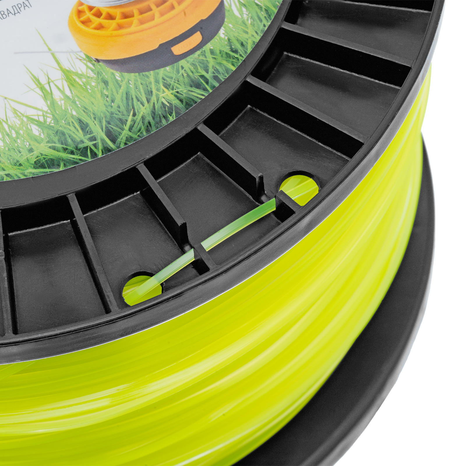 - Высокая производительность — благодаря острым граням леска быстро срезает траву.