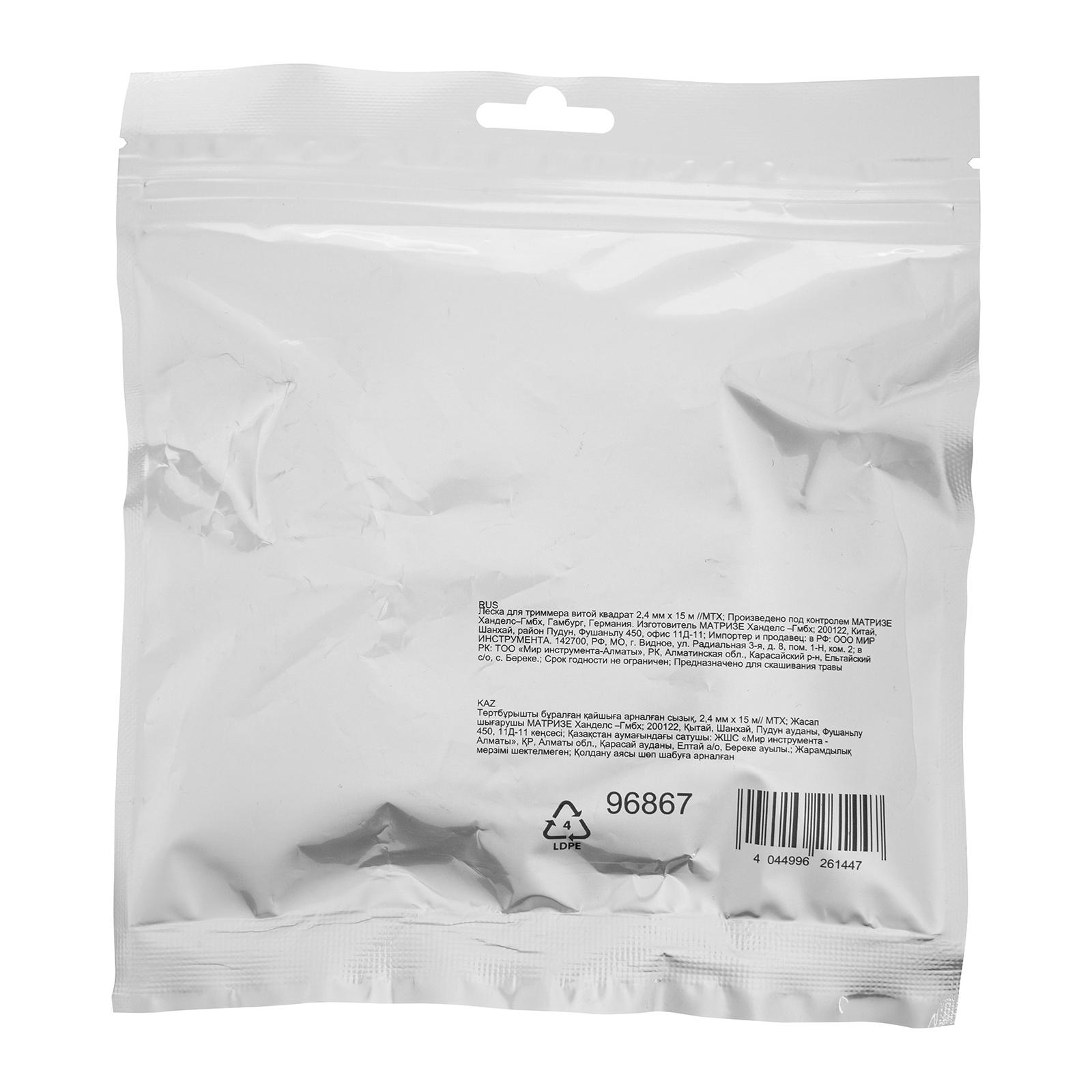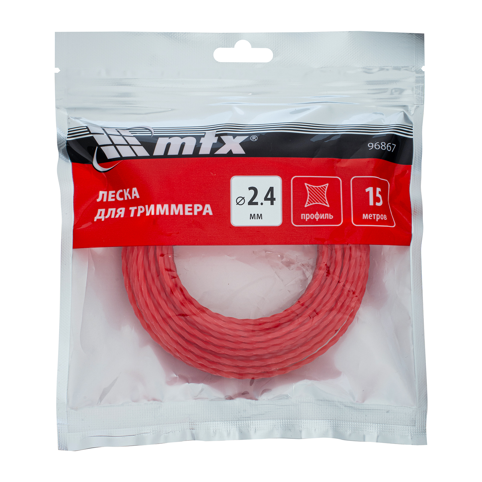 Леска для триммера MTX 96867 с сечением «витой квадрат», толщиной 2,4 мм и длиной 15 м, позволяет быстро и эффективно скашивать газонную, а также высокую и жесткую траву. Заправляется в катушку бензиновых триммеров. Пригодится для ухода за загородным участком, придомовой территорией и т.д.