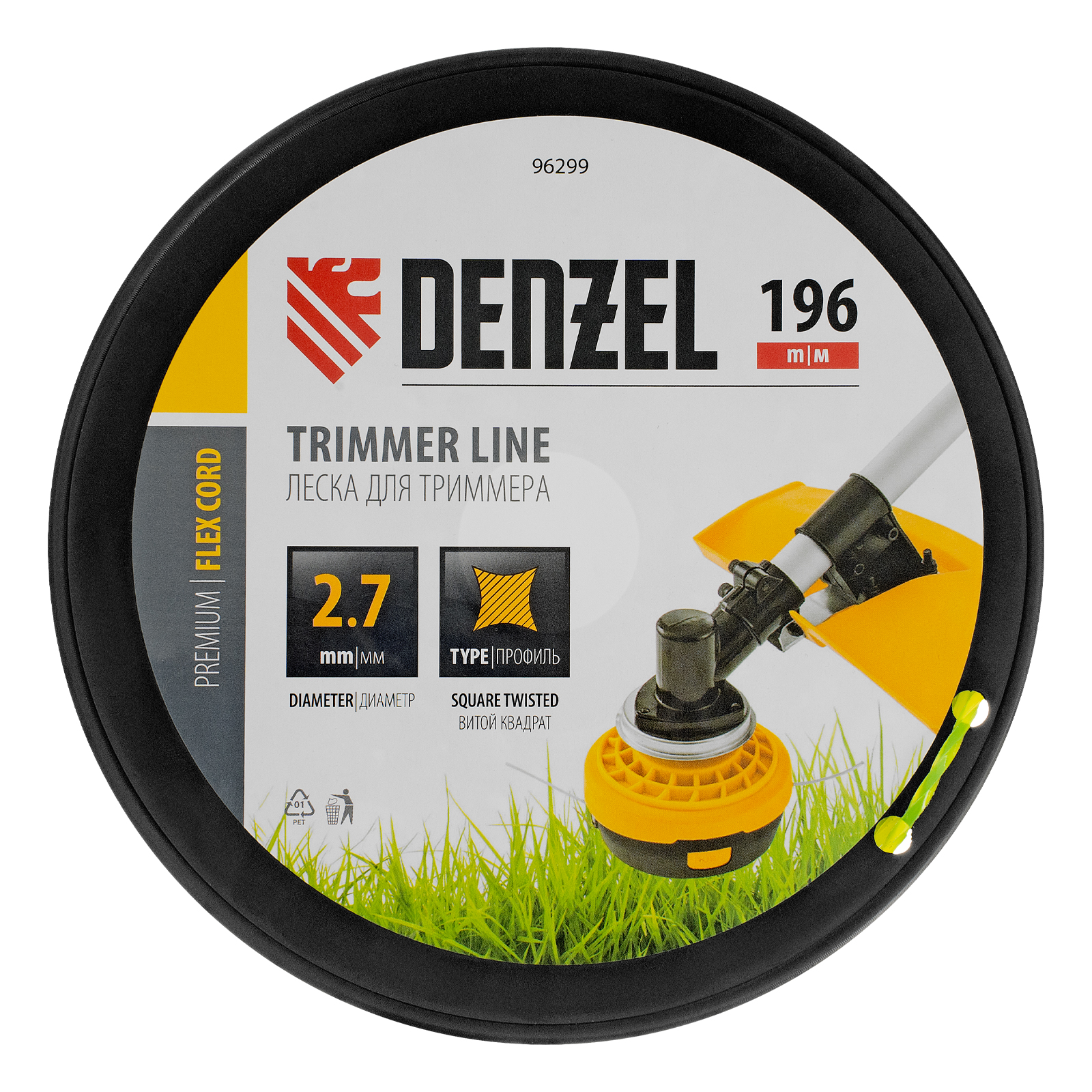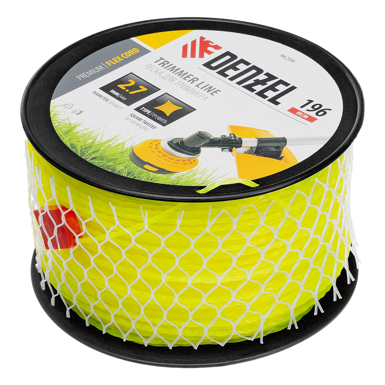 Леска для триммера Denzel FLEX CORD 96299 с сечением «витой квадрат», толщиной 2,7 мм и длиной 196 м, на DIN-катушке, предназначена для скашивания крупностеблевой растительности. Используется на бензиновых триммерах с объемом двигателя 25-52 см3 и электротриммерах мощностью от 1 до 1,5 кВт.