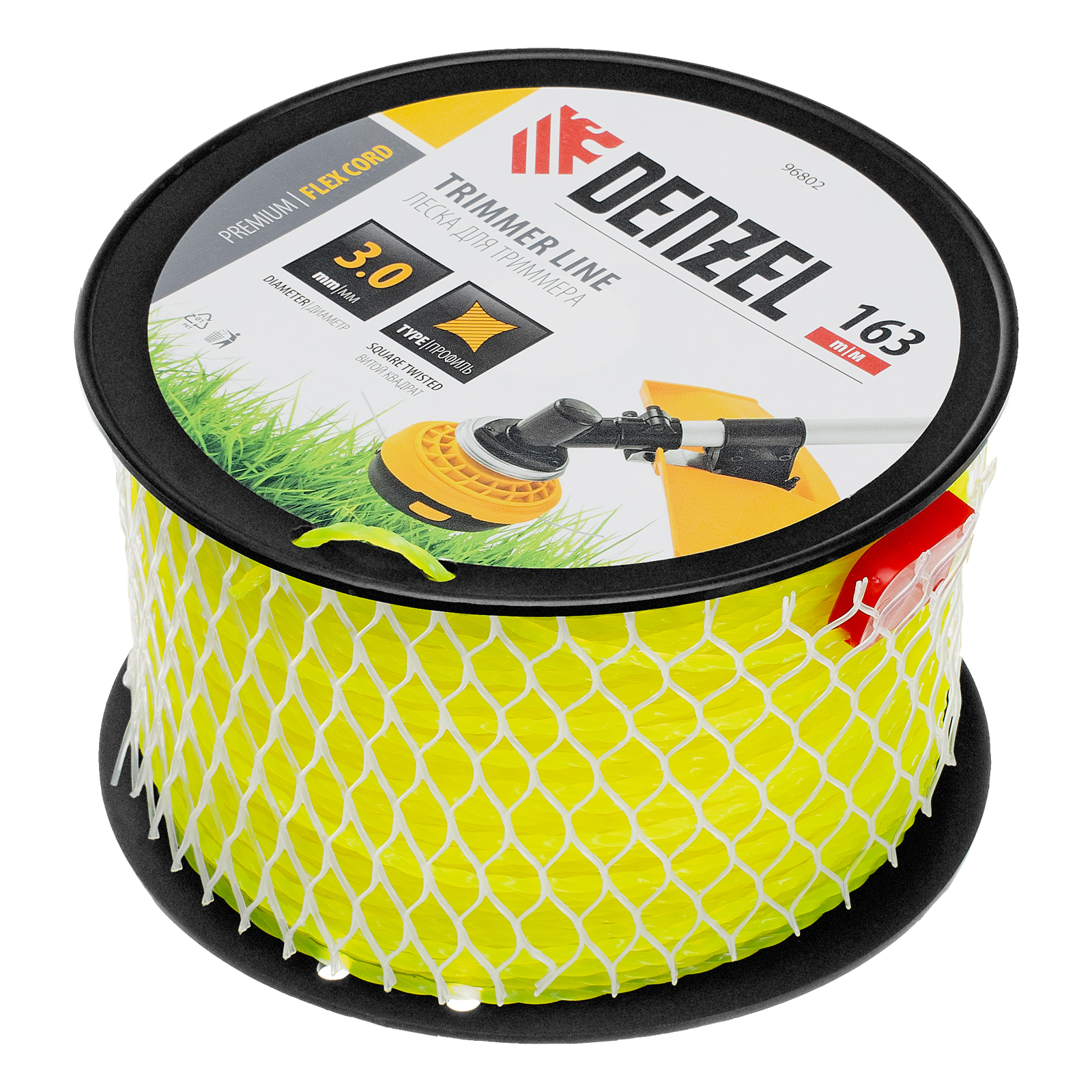 Леска для триммера Denzel FLEX CORD 96802 с сечением «витой квадрат», толщиной 3,0 мм и длиной 163 м, на DIN-катушке, предназначена для скашивания крупностеблевой растительности. Используется на бензиновых триммерах с объемом двигателя 25-52 см3 и электротриммерах мощностью от 1 до 1,5 кВт.