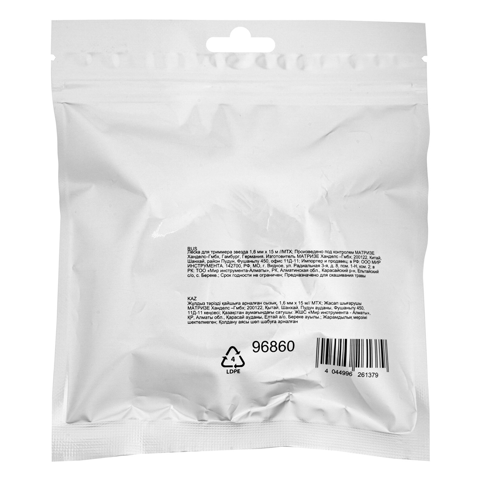 Леска для триммера MTX 96860 с сечением «звезда», толщиной 1,6 мм и длиной 15 м, предназначена для стрижки газонной травы, необходима для ухода за дачным участком. Используется в качестве расходного материала для электрических триммеров мощностью 300-600 Вт.