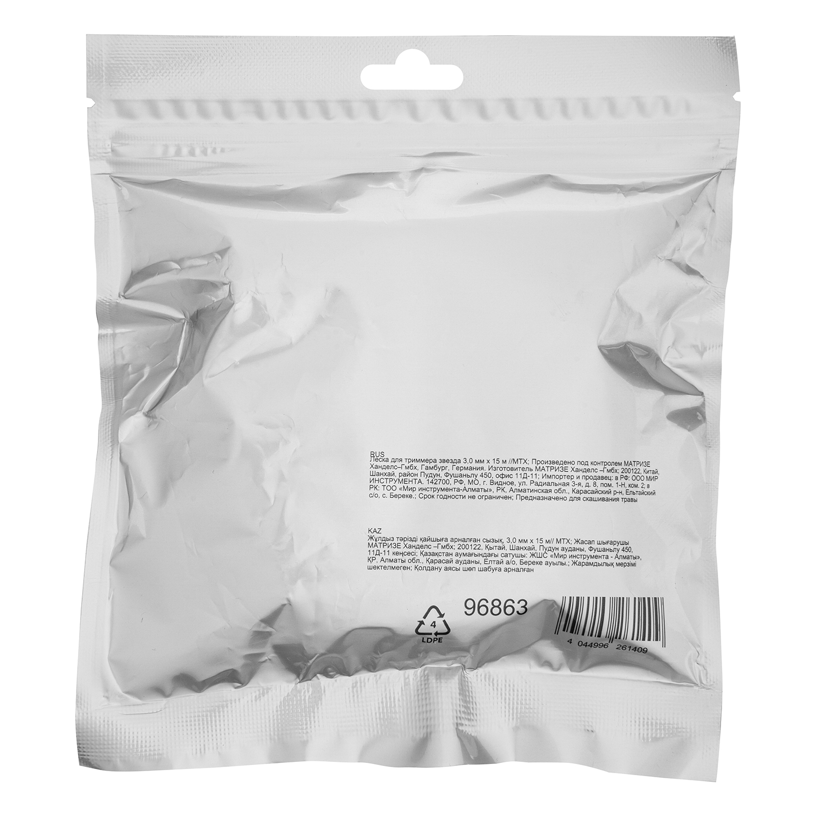 Леска для триммера MTX 96863 с сечением «звезда», толщиной 3,0 мм и длиной 15 м, подходит для скашивания как мягкой газонной, так и жесткой, а также сухой травы. Может применяться для срезания побегов кустов. Используется в качестве расходного материала для бензиновых триммеров. Необходима для ухода за дачным участком, пригодится сотрудникам коммунальных служб.