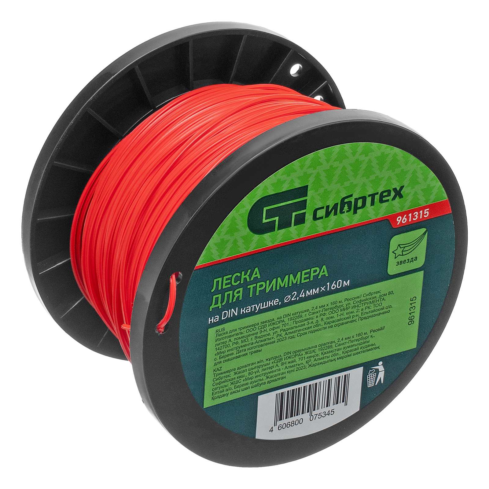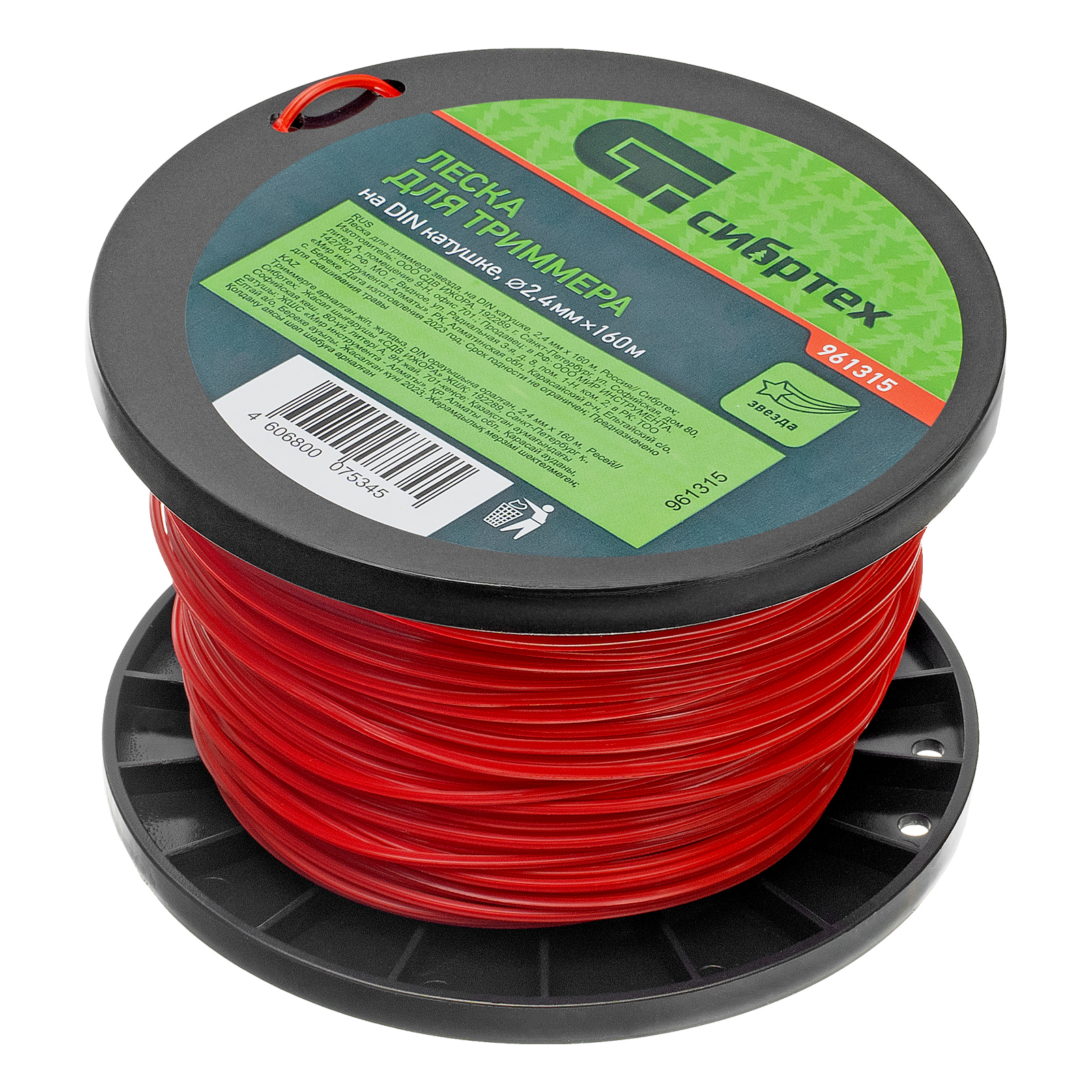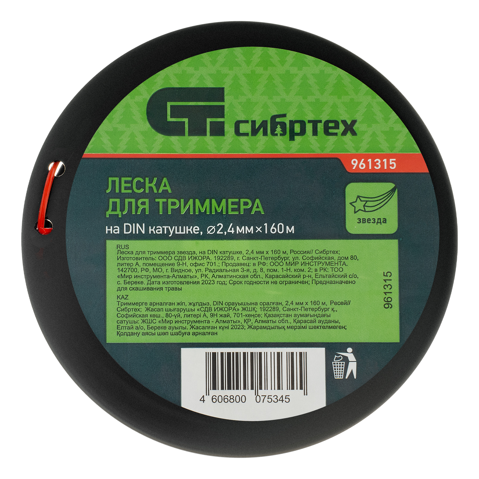 <p>Леска для триммера Сибртех 961315 с сечением «звезда», диаметром 2,4 мм и длиной 160 м, на DIN-катушке, подходит как для бензиновых, так и для электрических кос. Используется для скашивания молодой и сухой травы, бурьяна, небольших кустарников. Совместима с триммерными катушками любого типа: автоматическими, полуавтоматическими и механическими</p><h2>Преимущества</h2><ul><li>Надежность и долговечность — леска из высокопрочного гибкого нейлона не рвется и медленно изнашивается.</li><li>Точный и ровный срез — благодаря сечению “звезда” трава не рвется и не желтеет после обработки.</li><li>Эффективная работа — острые грани быстро срезают траву, что позволяет уменьшить нагрузку на двигатель триммера.</li><li>Удобное хранение — концы корда можно зафиксировать в прорезях на DIN-катушке.</li><li>Длина 160 м — лески хватит на несколько сезонов.</li></ul>