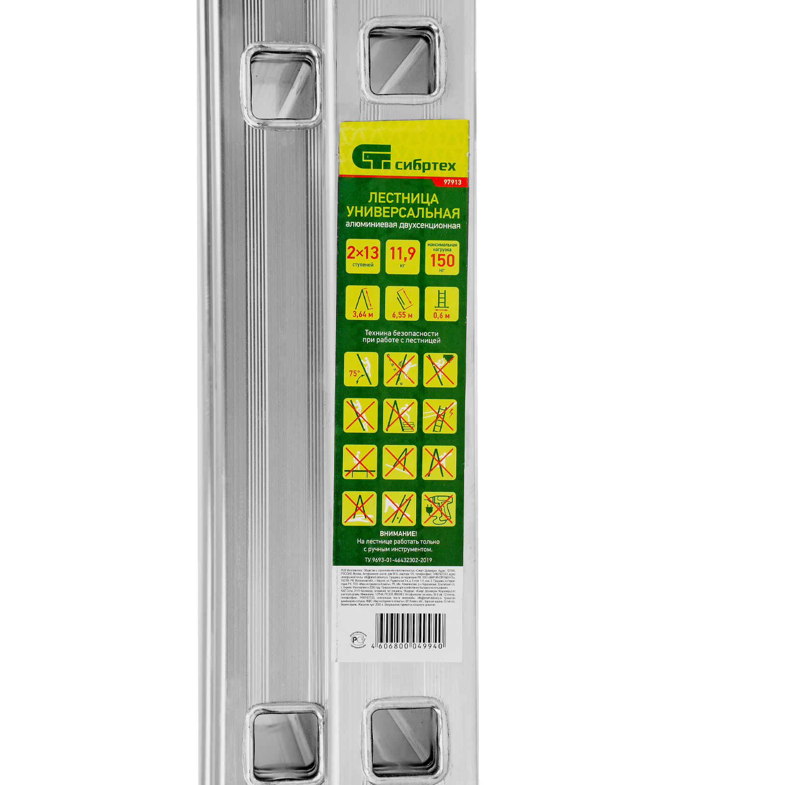 Алюминиевая двухсекционная лестница Сибртех 97913 состоит из 2 секций по 13 ступеней каждая. Легкая и прочная, она используется в качестве двухсторонней стремянки, предназначена для бытового и полупрофессионального применения.
