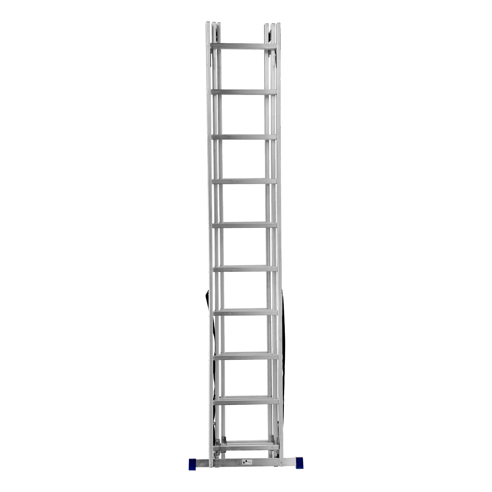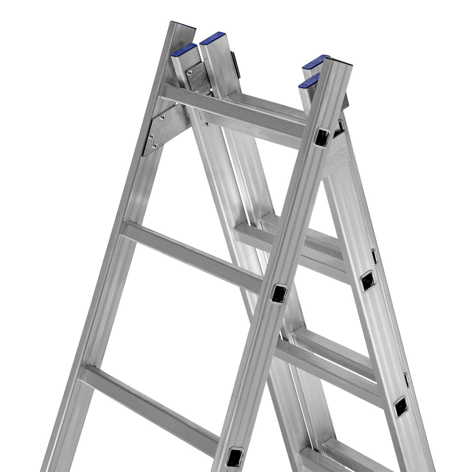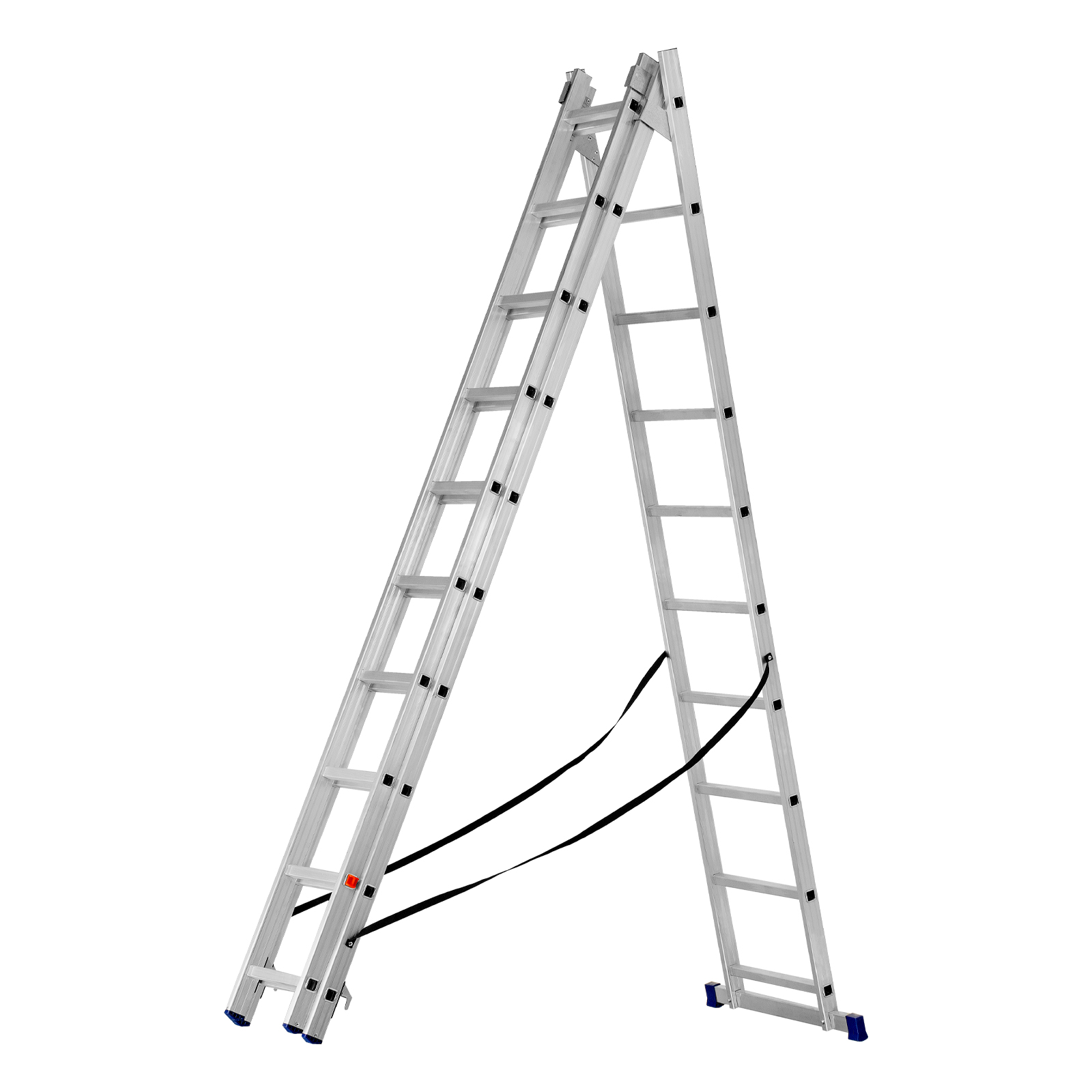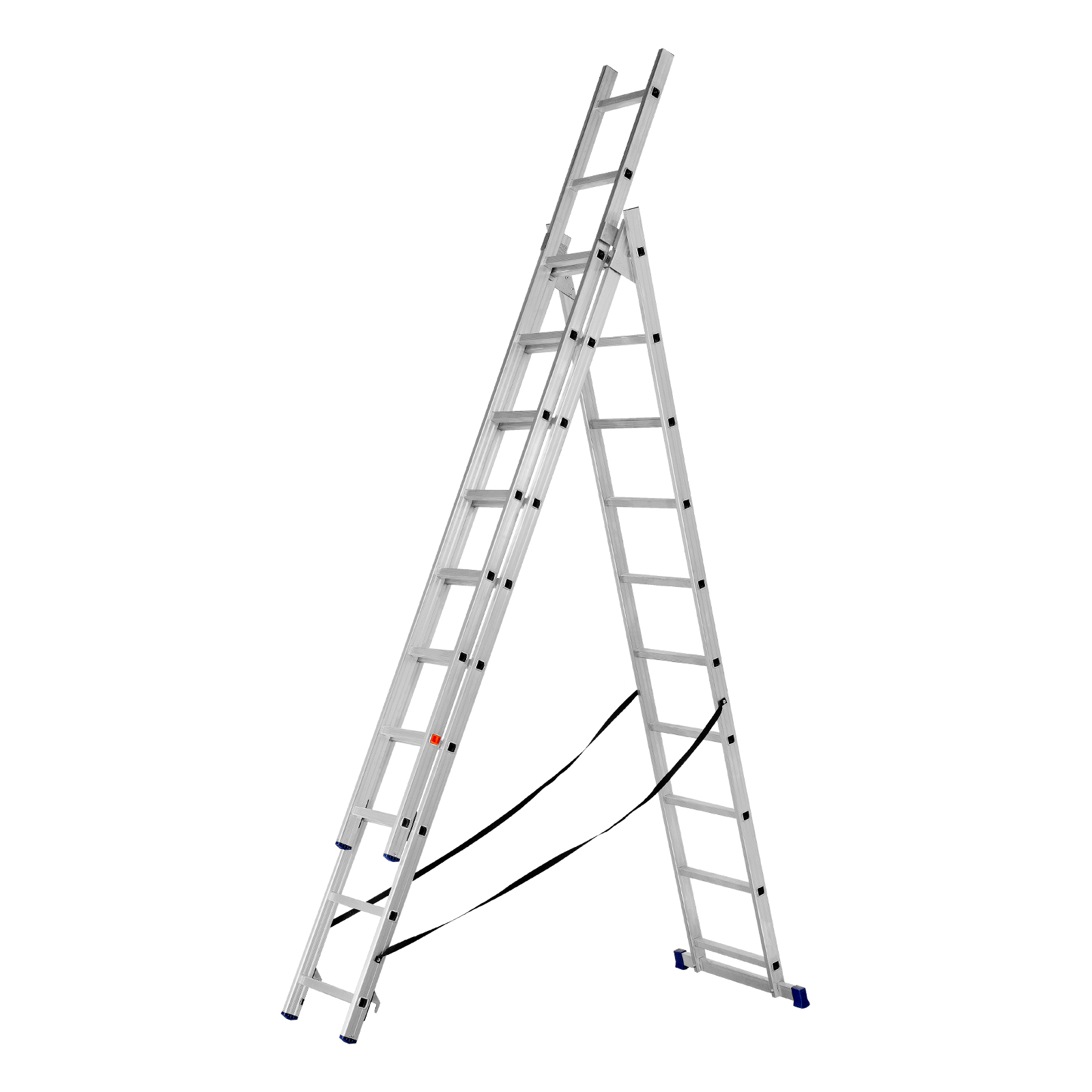 - Многофункциональность — лестница может использоваться в 3 различных вариациях — в качестве стремянки (с двумя расставленными и одной выдвинутой вверх секцией), двухсторонней стремянки (две секции расставлены, третья демонтирована) и приставной лестницы.