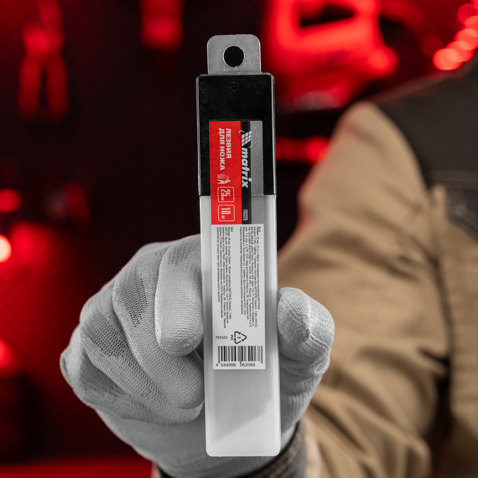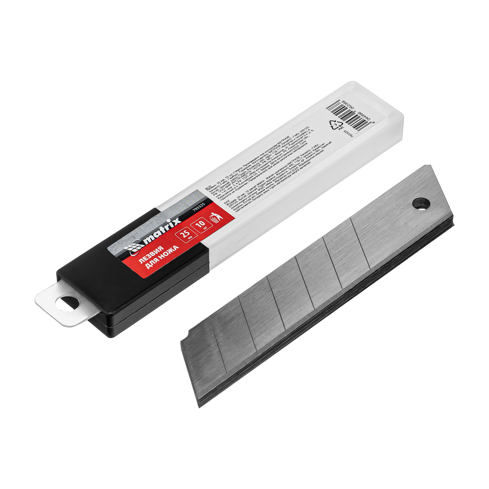 <p>Лезвия Matrix 793325 шириной 25 мм и длиной 125 мм, 10 шт. в упаковке, — запасные части к монтажным ножам соответствующего типоразмера. Ими можно резать твердые материалы, линолеум, пластик, гипсокартон, а также бумагу, пленку, картон. Лезвия используются при проведении строительных и отделочных работ, а также применяются в хозяйственных целях.</p><h2>Преимущества</h2><ul><li>Прочность и износостойкость — лезвия изготовлены из высокоуглеродистой стали толщиной 0,6 мм и остро заточены.</li><li>Отсутствие необходимости в частой замене — если режущая кромка затупится, достаточно отломить отработавший сегмент.</li><li>Удобное хранение — расходники, упакованные в ПВХ-пенал, не потеряются.</li><li>Продуманная комплектация — в упаковке 10 штук, которых хватит надолго.</li></ul>