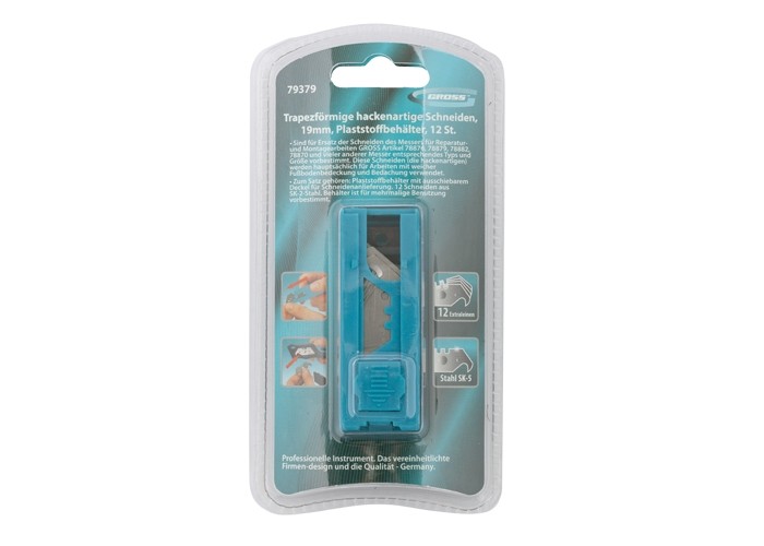 Трапециевидные крючкообразные лезвия Gross 79379 шириной 19 мм, 12 шт. в упаковке, устанавливаются на монтажные ножи подходящего типоразмера — Gross 78876, 78879, 78882, 78870 и другие, кроме арт. 78873 и 78885. Легко режут ковролин, линолеум и другие мягкие напольные покрытия, оптимальны для использования во время ремонта.
