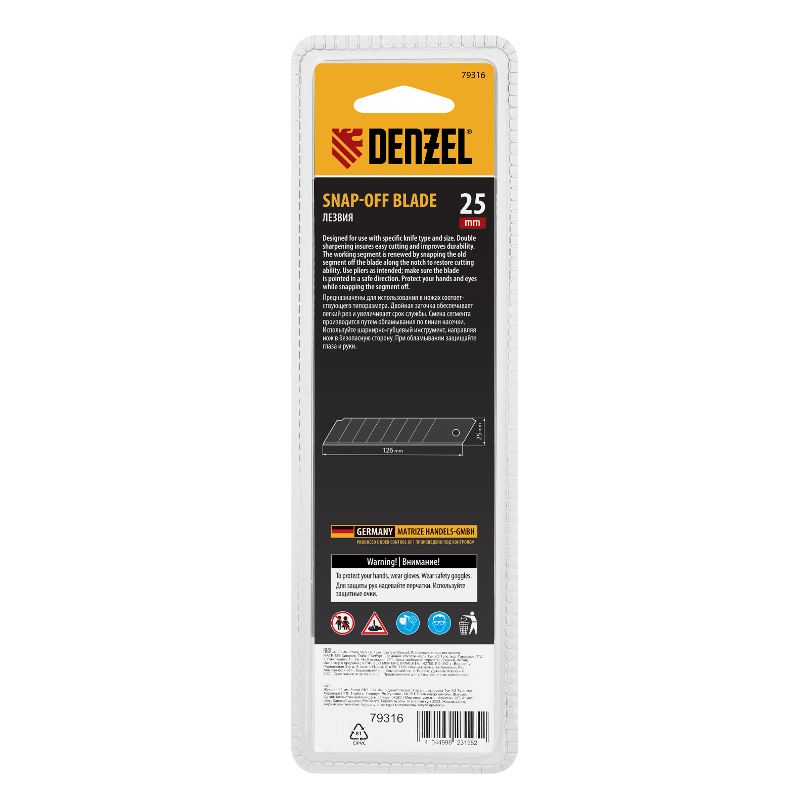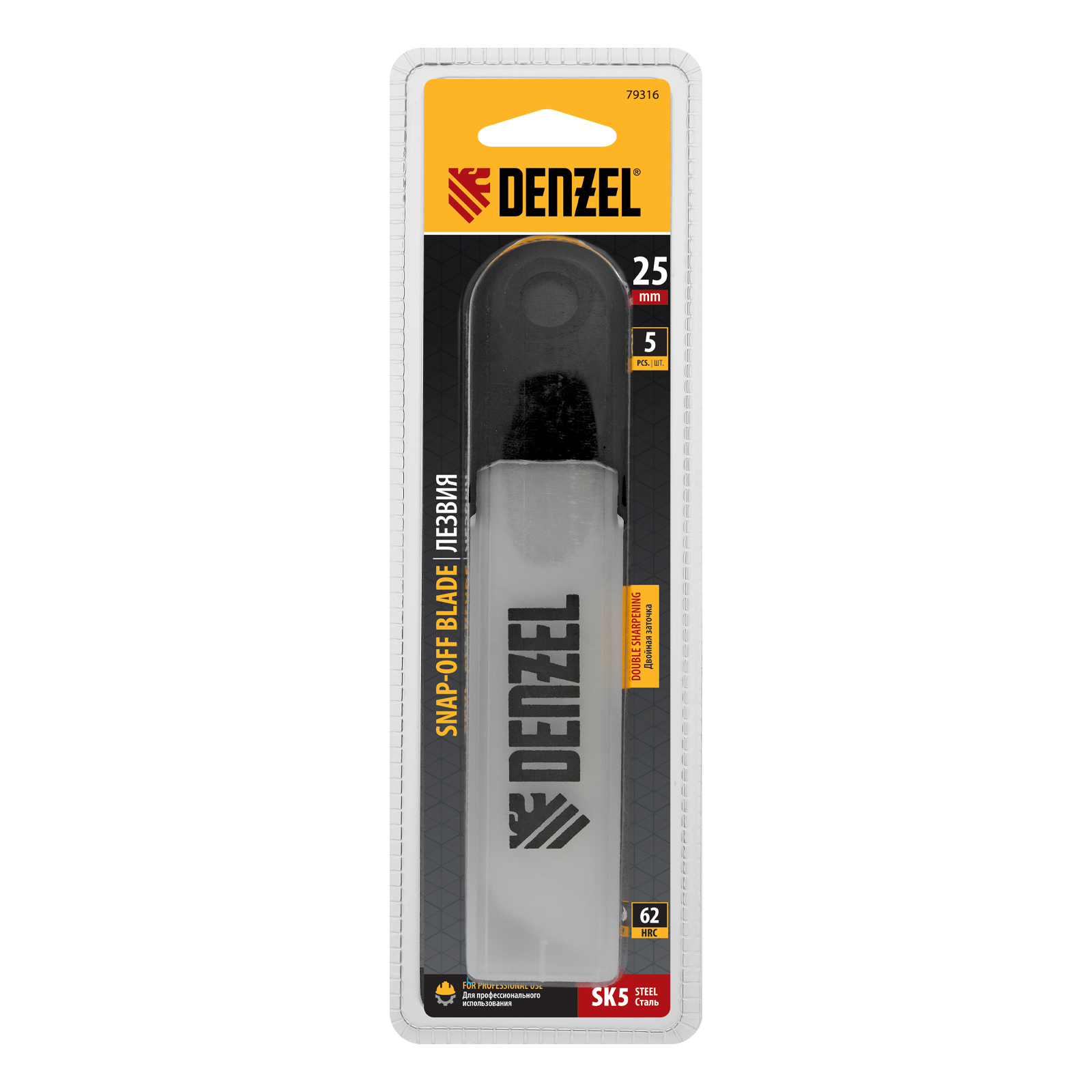 Лезвия Denzel 79316 шириной 25 мм, изготовленные из стали SK5 толщиной 0,7 мм, 5 шт. в упаковке, — сменные рабочие элементы для монтажных ножей соответствующего типоразмера. Подходят для разрезания твердых материалов, линолеума, пластика, гипсокартона, а также картона, пленки, обоев. Обеспечивают легкий рез. Отличаются повышенной прочностью и долговечностью по сравнению с аналогами других торговых марок. Лезвия остро заточены и хорошо гнутся, могут применяться для проведения строительных и отделочных работ, а также в бытовых целях.