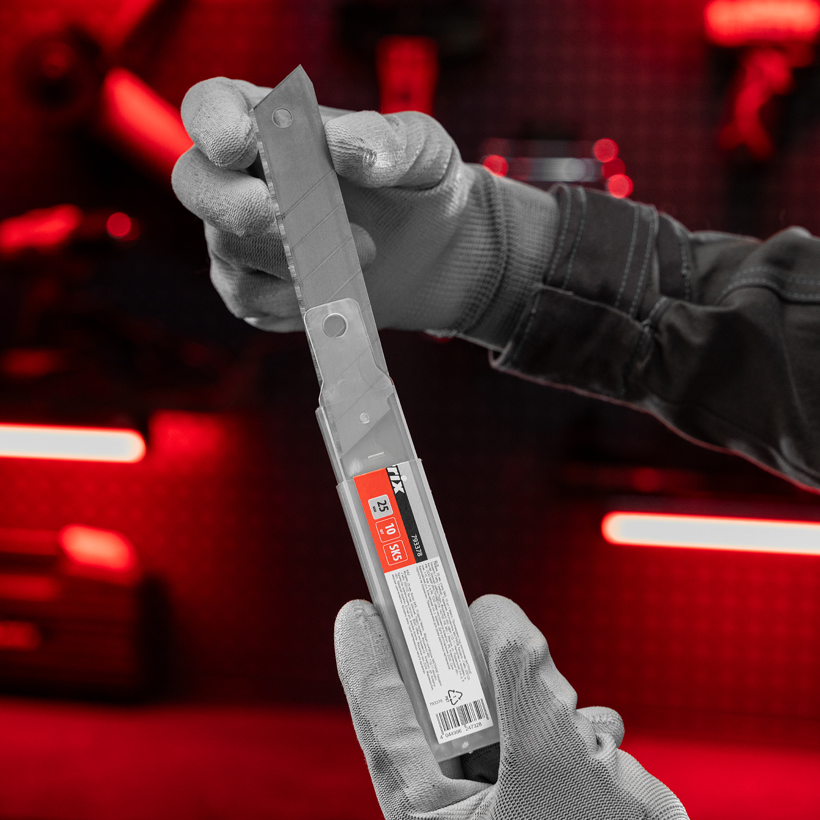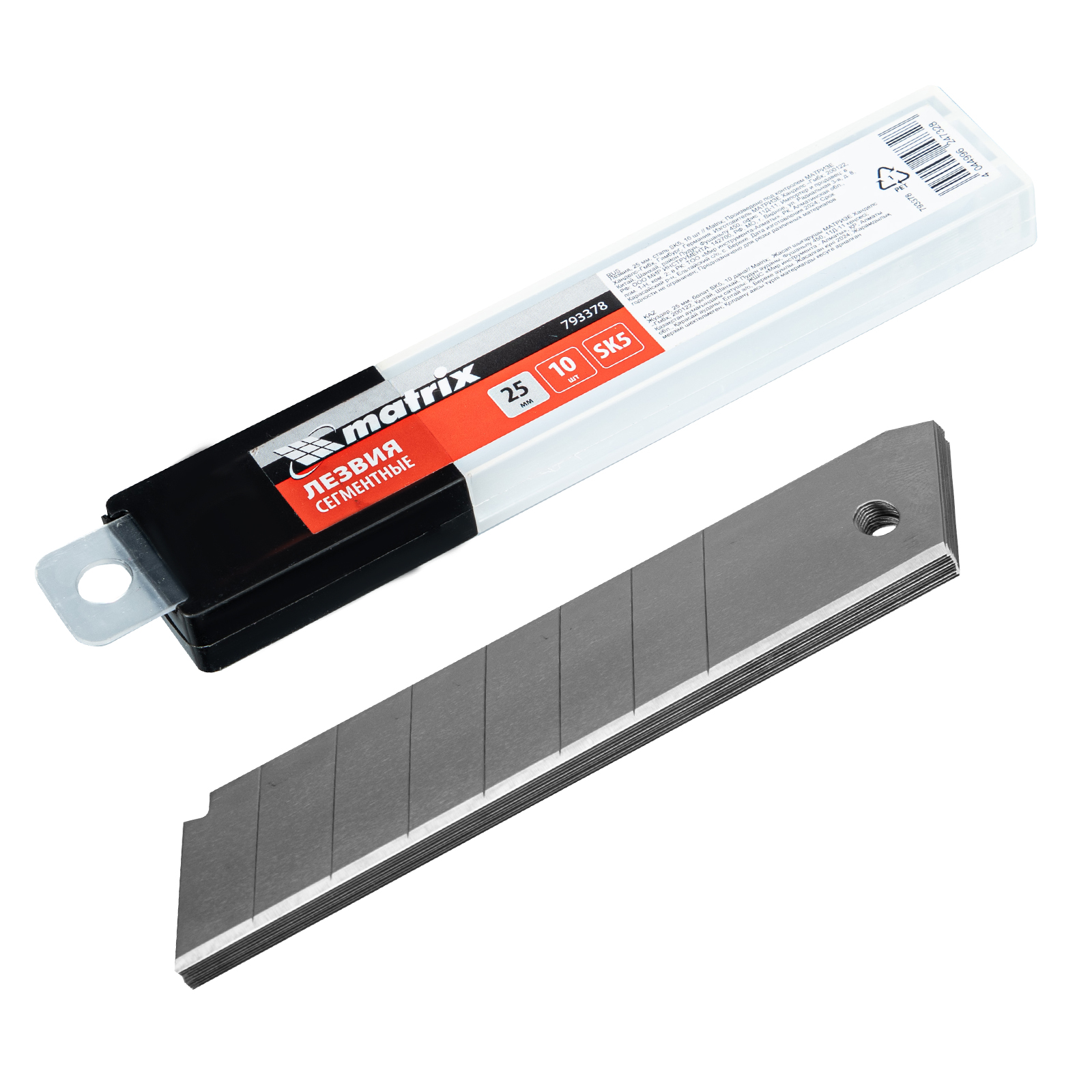 <p>Лезвия Matrix 793378 из стали SK5, шириной 25 мм и длиной 125 мм, 10 шт. в упаковке, — сменные режущие элементы для монтажных ножей соответствующего типоразмера. Режут бумагу, пленку, картон, а также плотные материалы: линолеум, пластик, гипсокартон. Используются во время проведения строительных и отделочных работ, также полезны в быту.</p><h2>Преимущества</h2><ul><li>Прочность и износостойкость — лезвия изготовлены из японской стали SK5 толщиной 0,5 мм и остро заточены.</li><li>Отсутствие необходимости в частой замене — если режущая кромка затупится, достаточно отломить отработавший сегмент.</li><li>Удобное хранение — расходники, упакованные в ПВХ-кейс, не потеряются.</li><li>Продуманная комплектация — в упаковке 10 лезвий, которых хватит надолго.</li></ul>