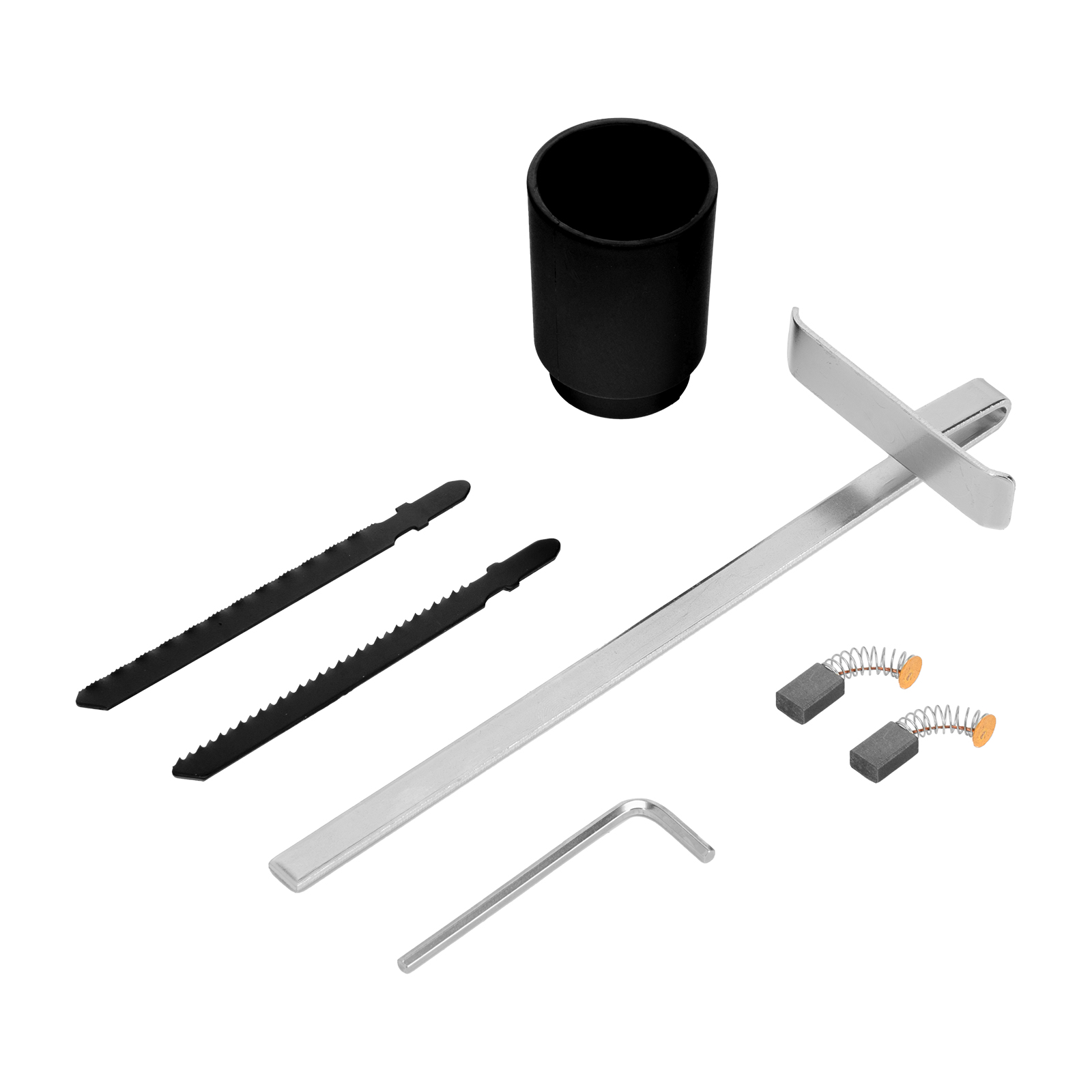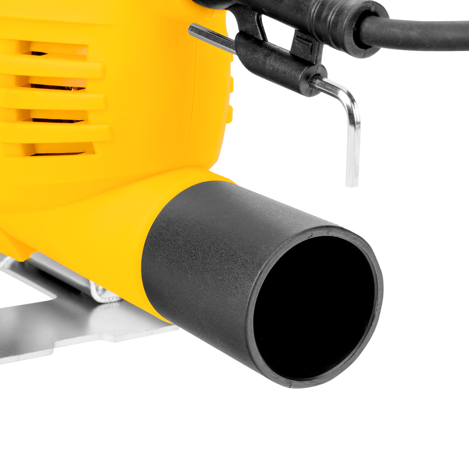 - Готовность к работе — в комплект поставки входит параллельная направляющая, 2 пильных полотна (для древесины и металла), переходник для пылесоса и шестигранный ключ.