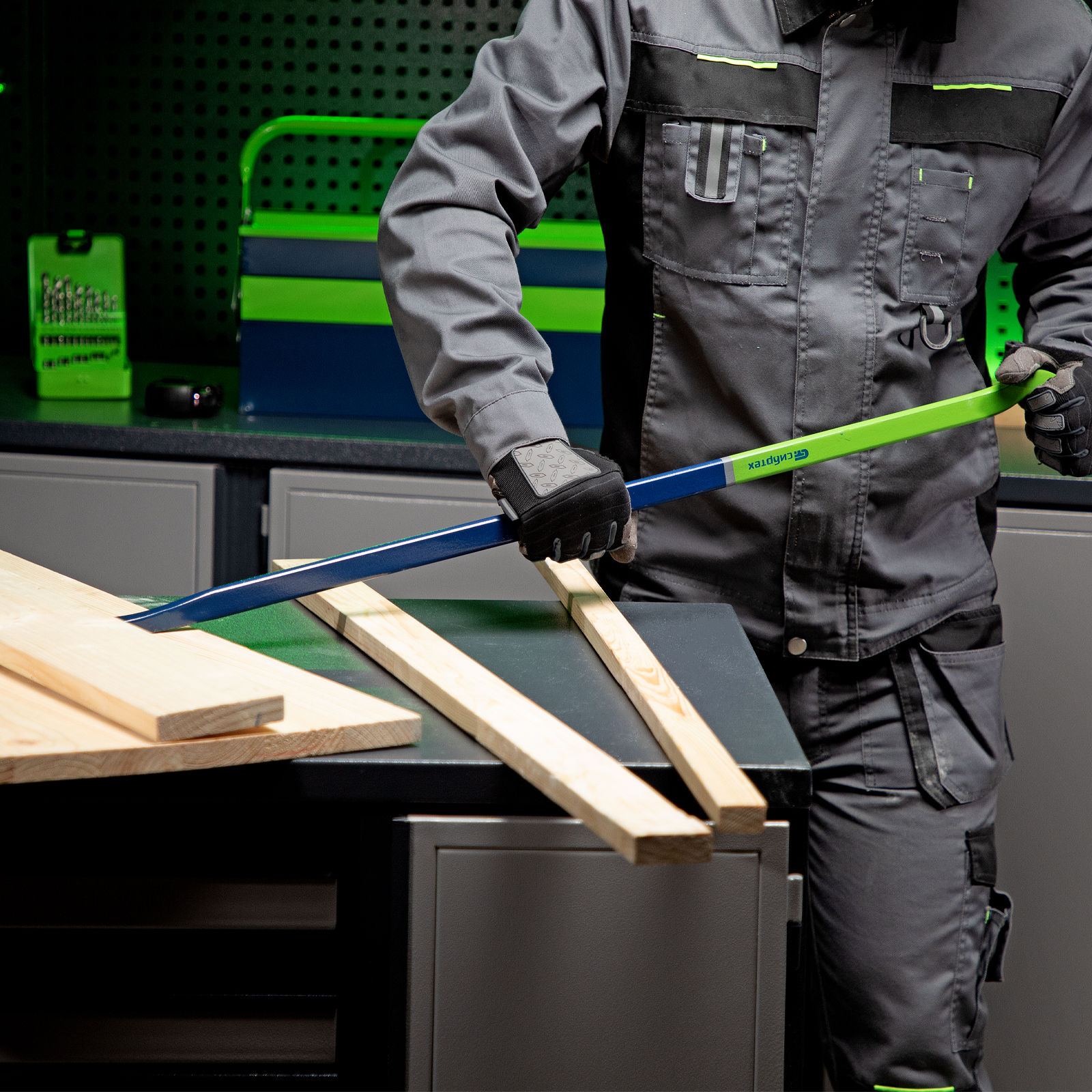 Лом-гвоздодер Сибртех 25245 размером 900 х 25 х 12 мм позволяет удалять гвозди, а также срывать доски с пола, разбирать ящики, демонтировать заборы, вагонку со стен или шифер с крыши. Может служить рычагом для поднимания грузов, поскольку прямоугольно-овальный профиль значительно усиливает его на момент излома. Инструмент подходит для профессионального и бытового применения.
